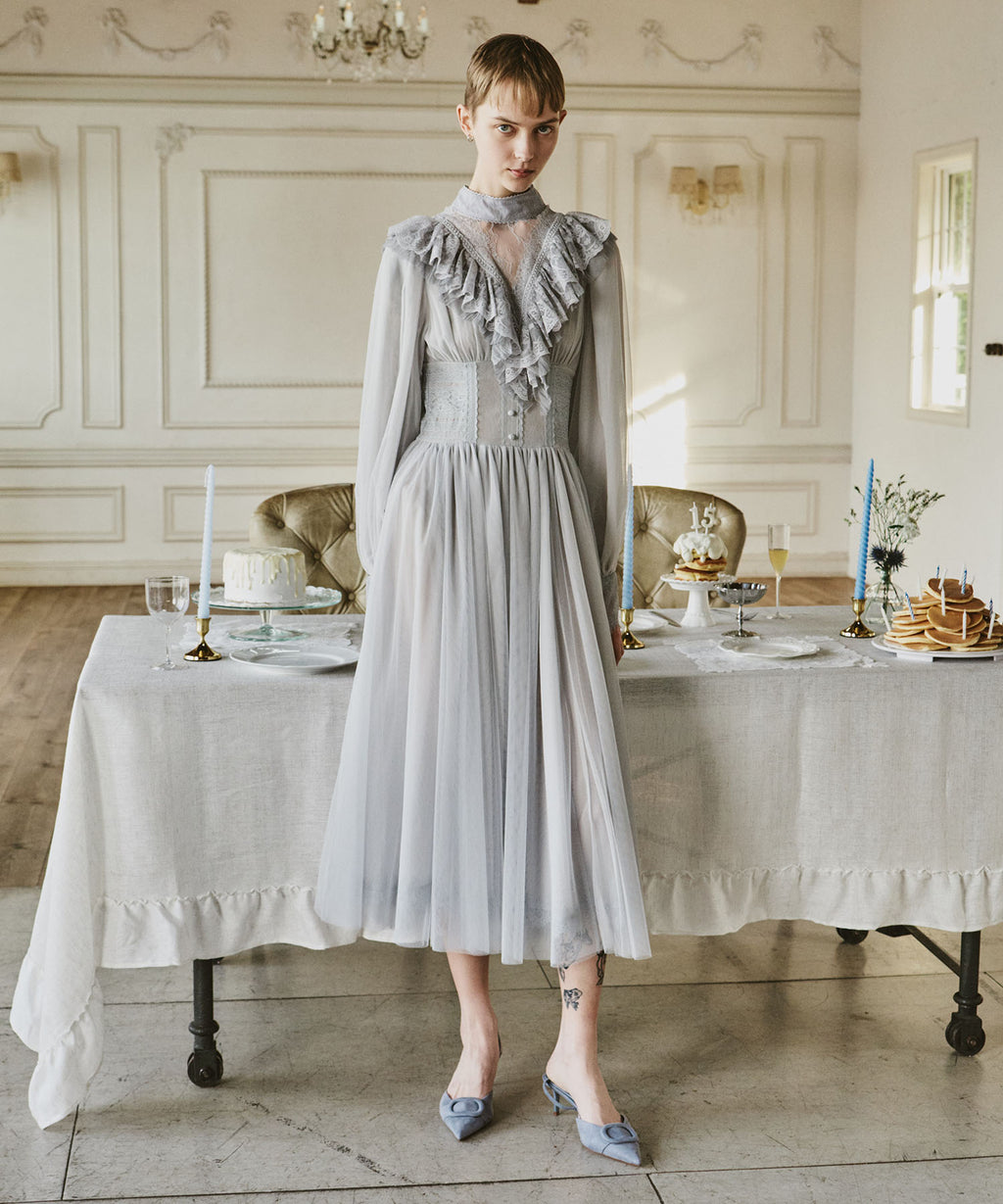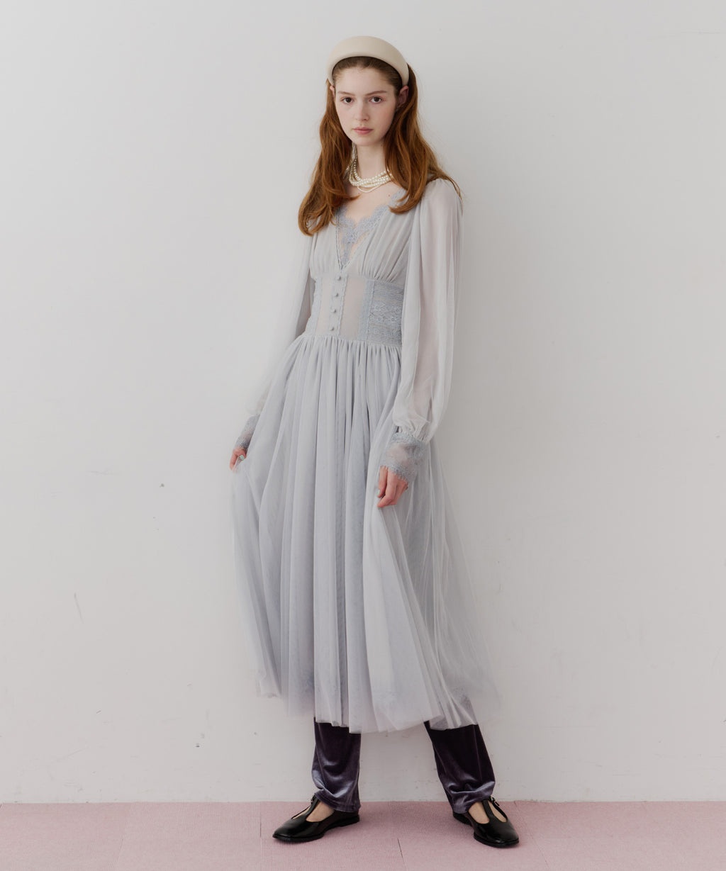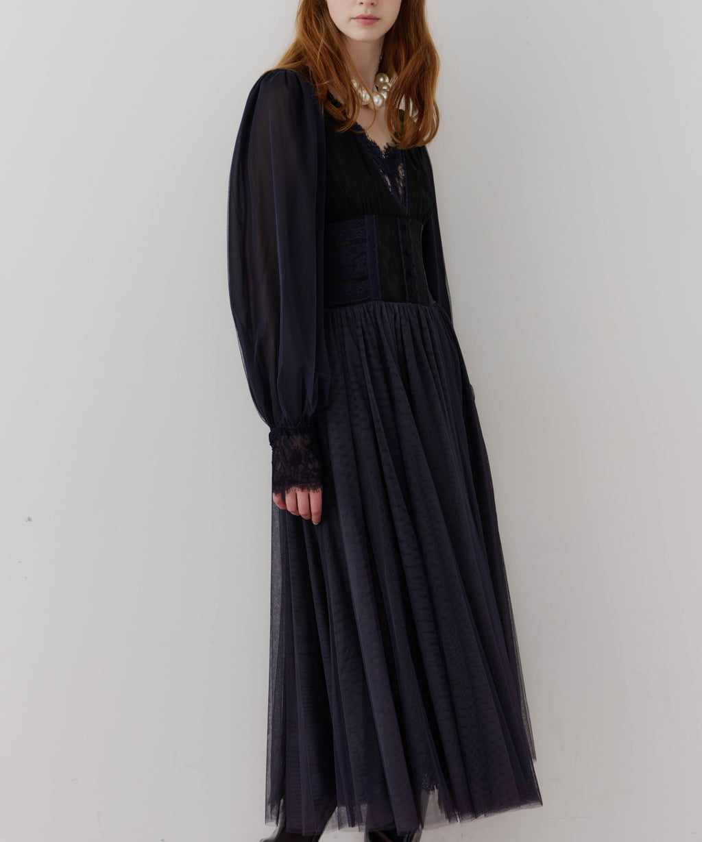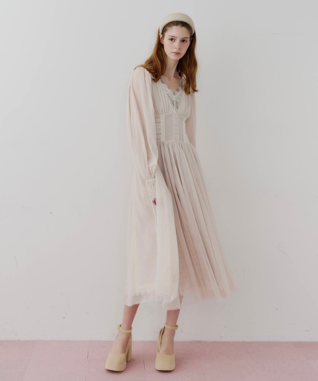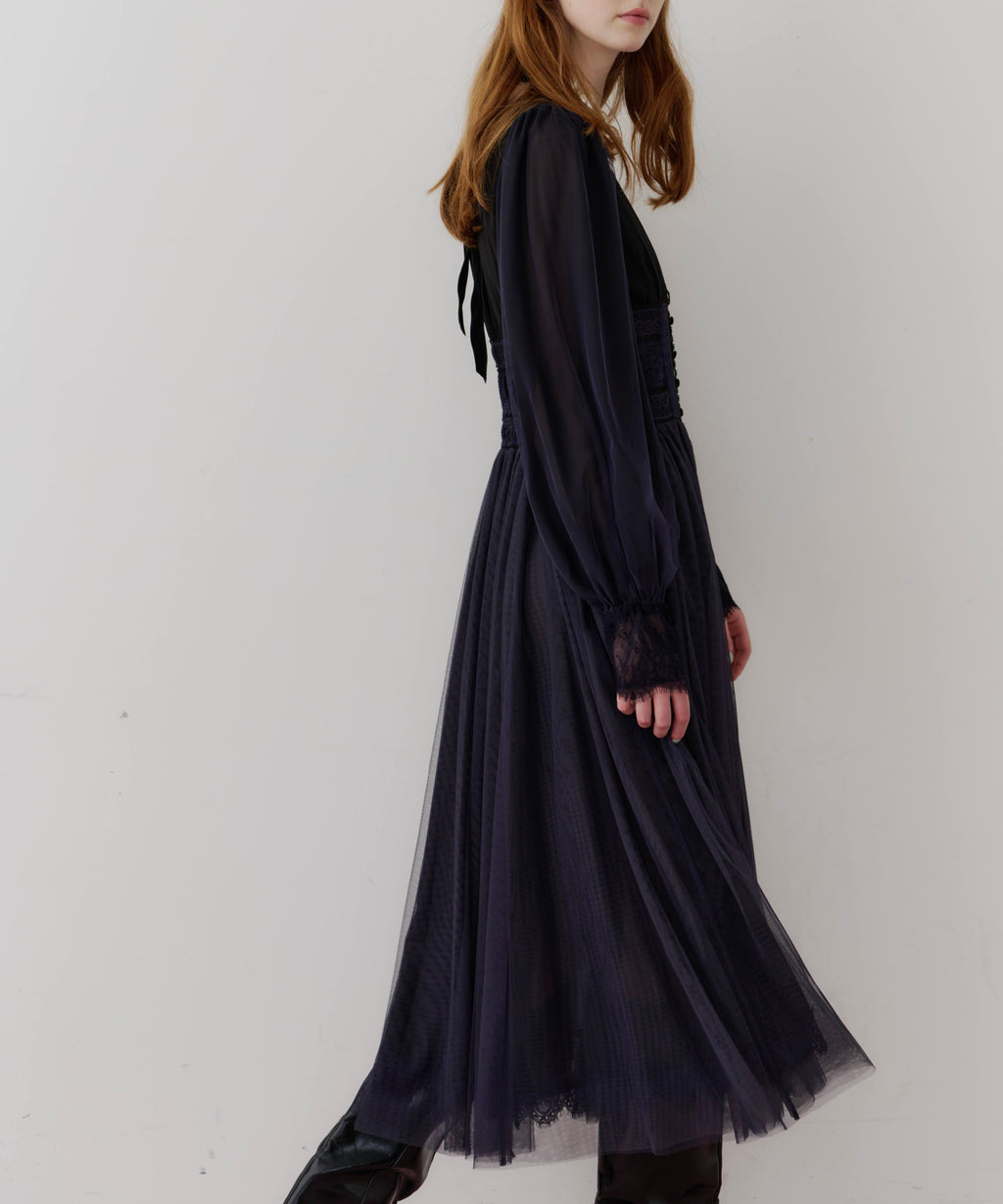 スカート部分はシフォンの上に二枚のチュールを重ね、軽やかな着心地と見え方に。