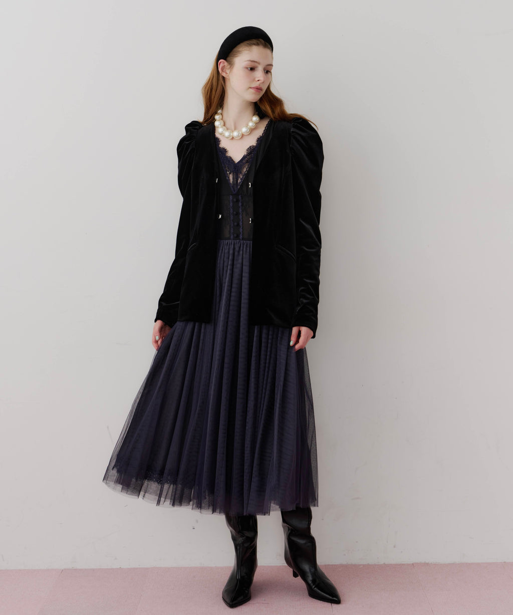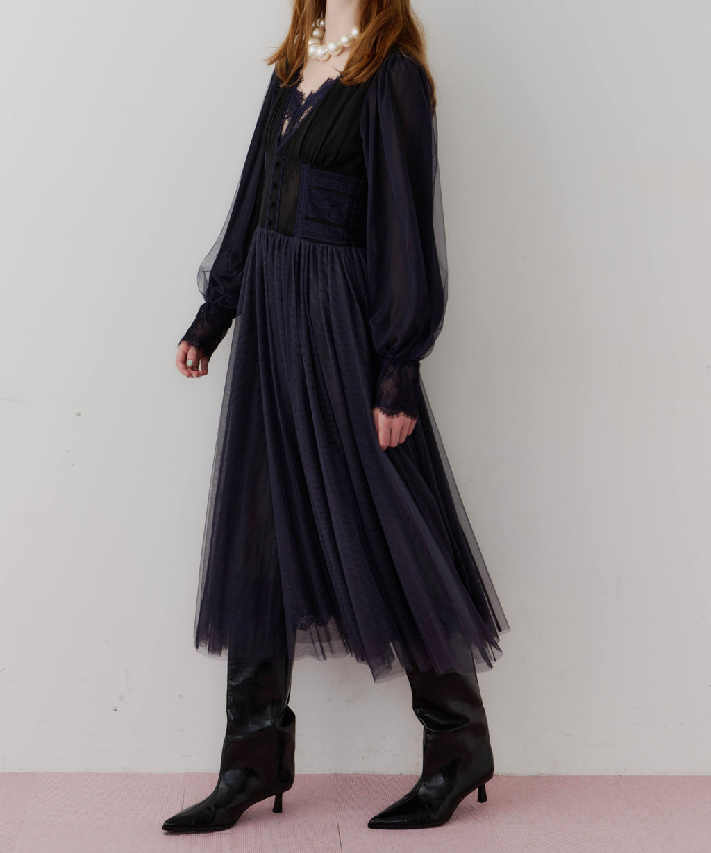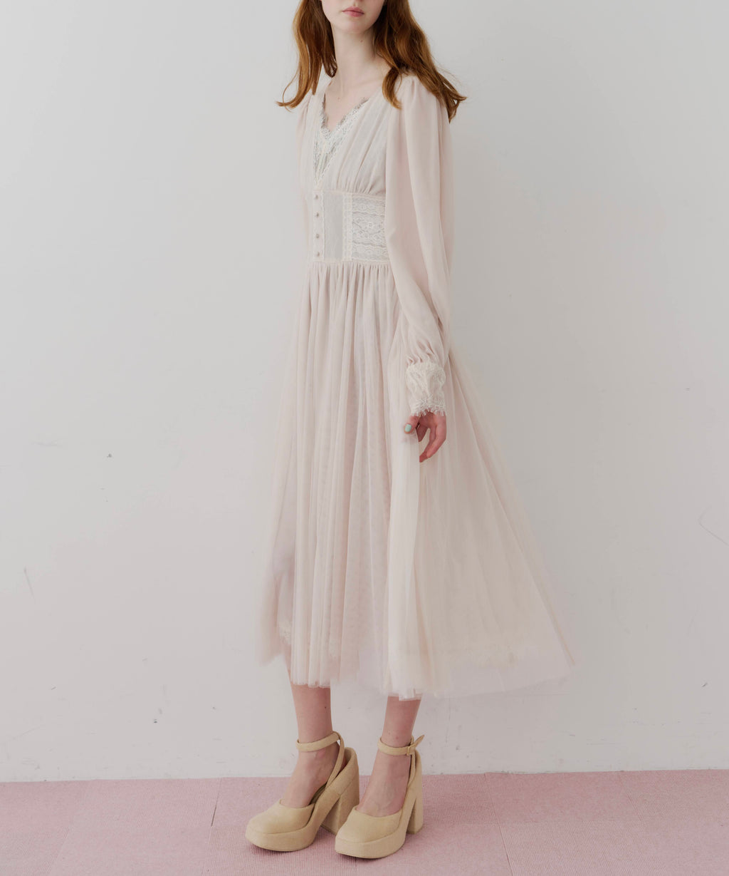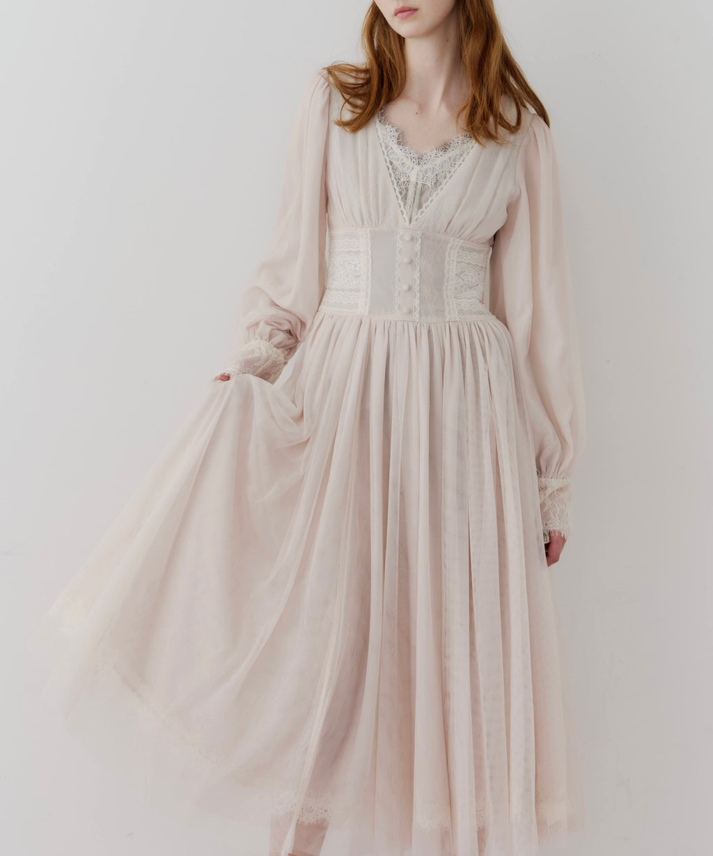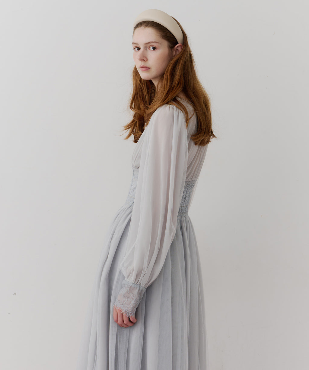 スカート部分はシフォンの上に二枚のチュールを重ね、軽やかな着心地と見え方に。