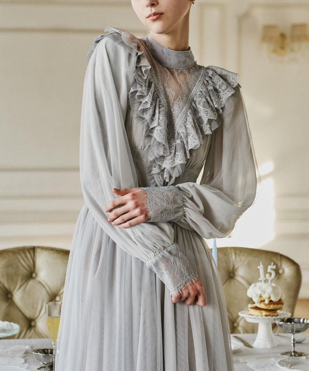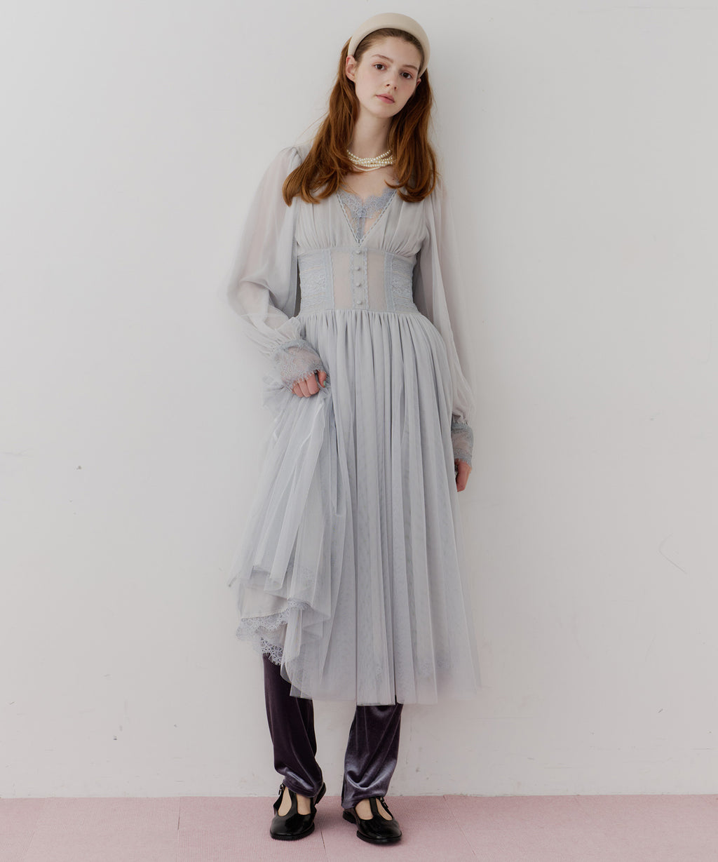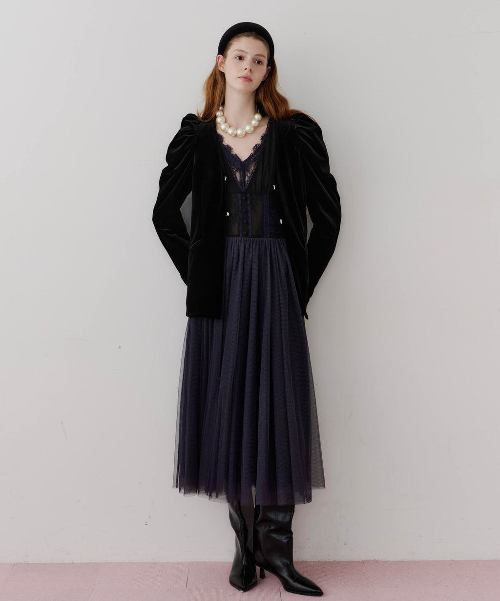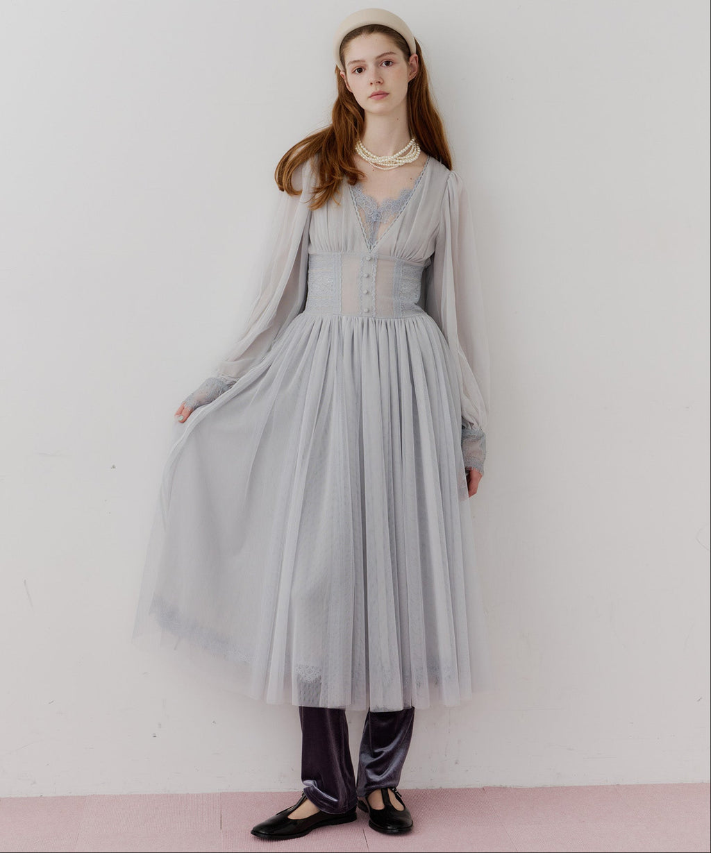 スカート部分はシフォンの上に二枚のチュールを重ね、軽やかな着心地と見え方に。