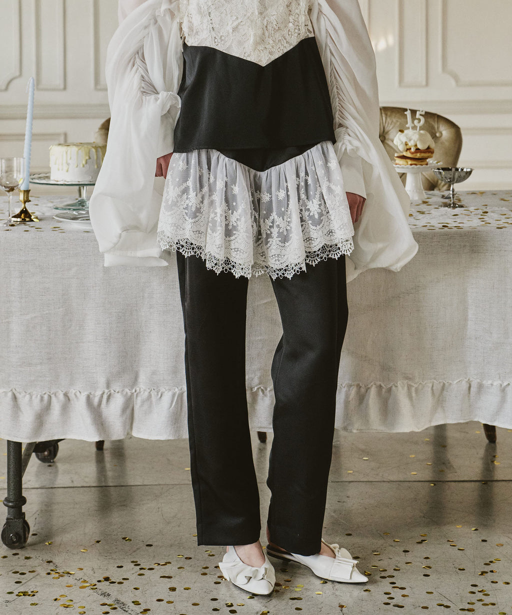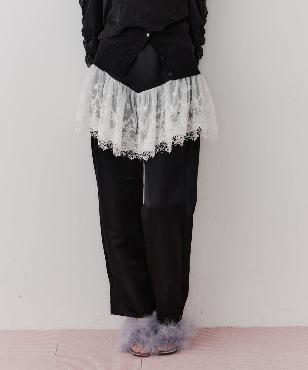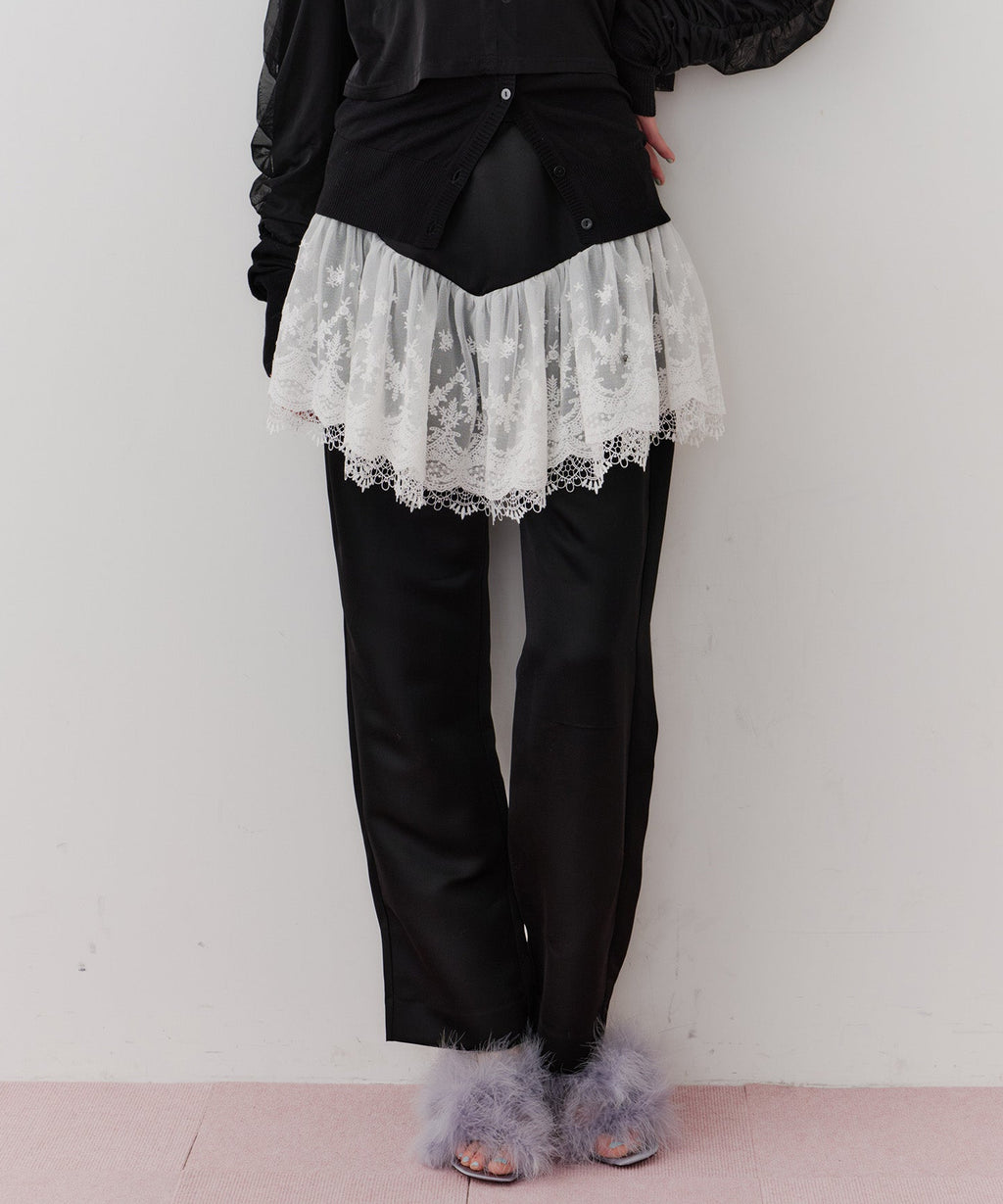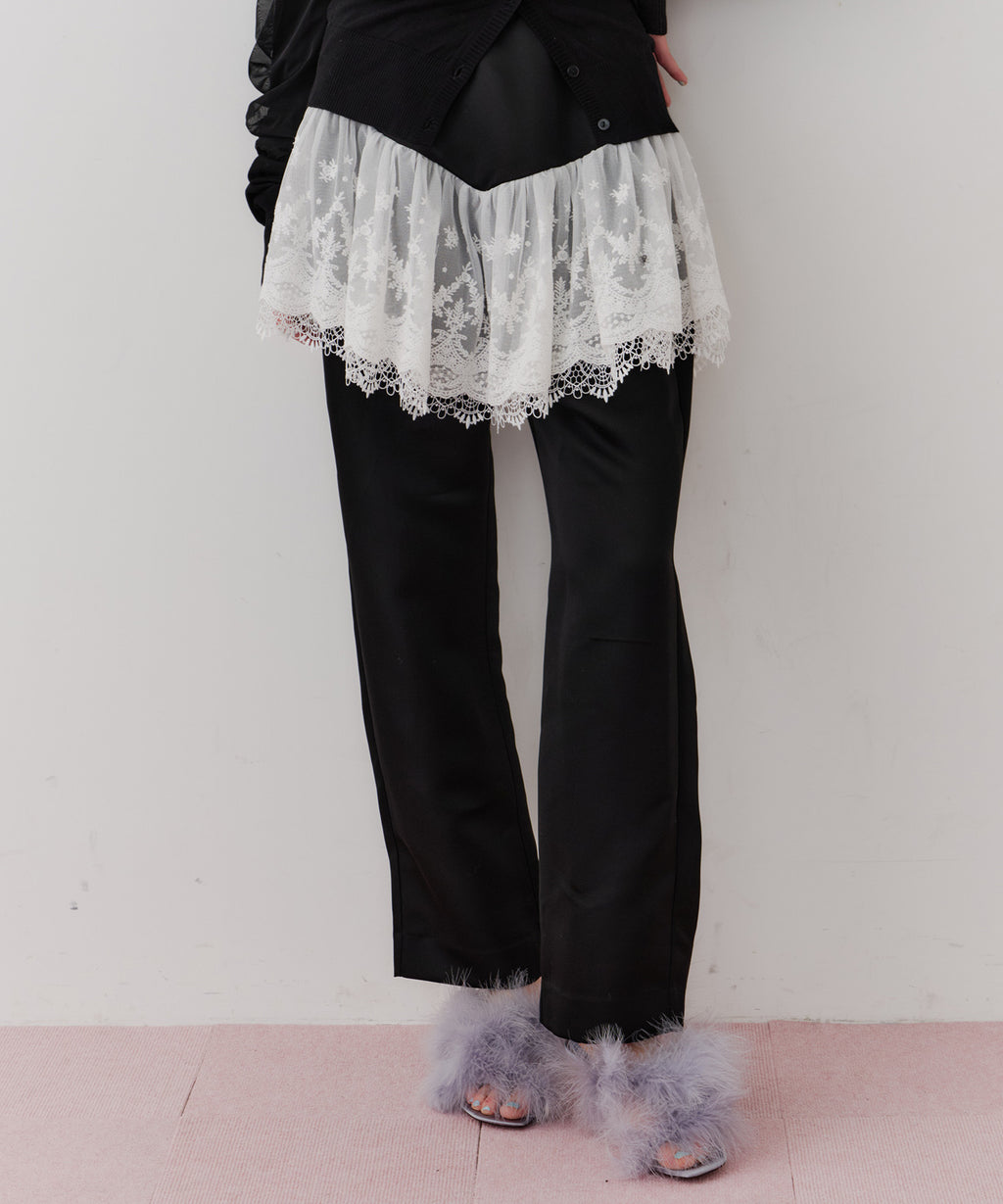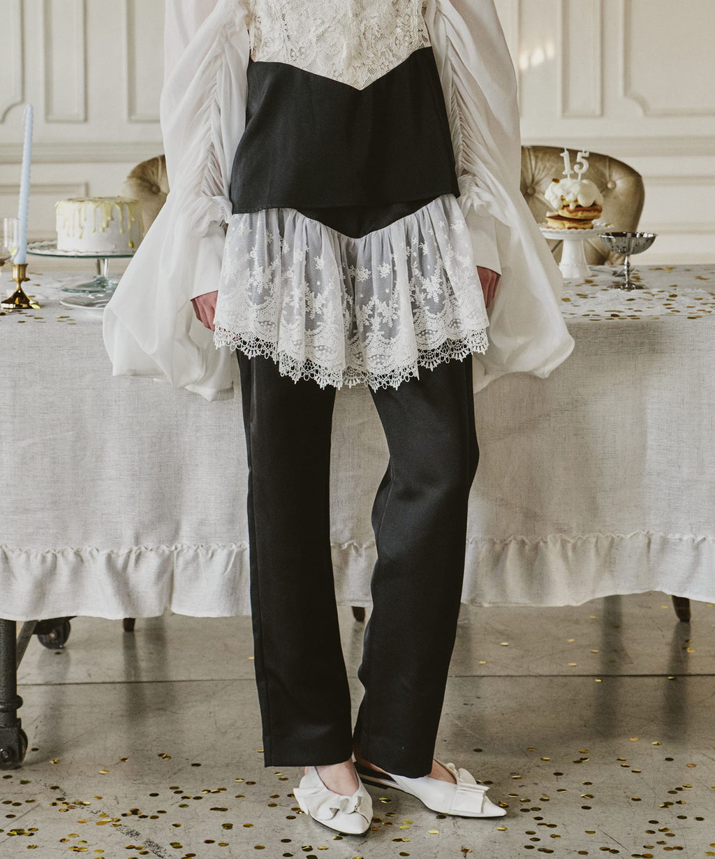 シンプルなストレートパンツにクラシカルレースをドッキング。
