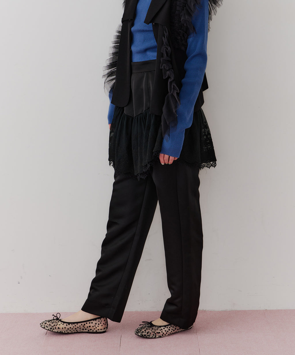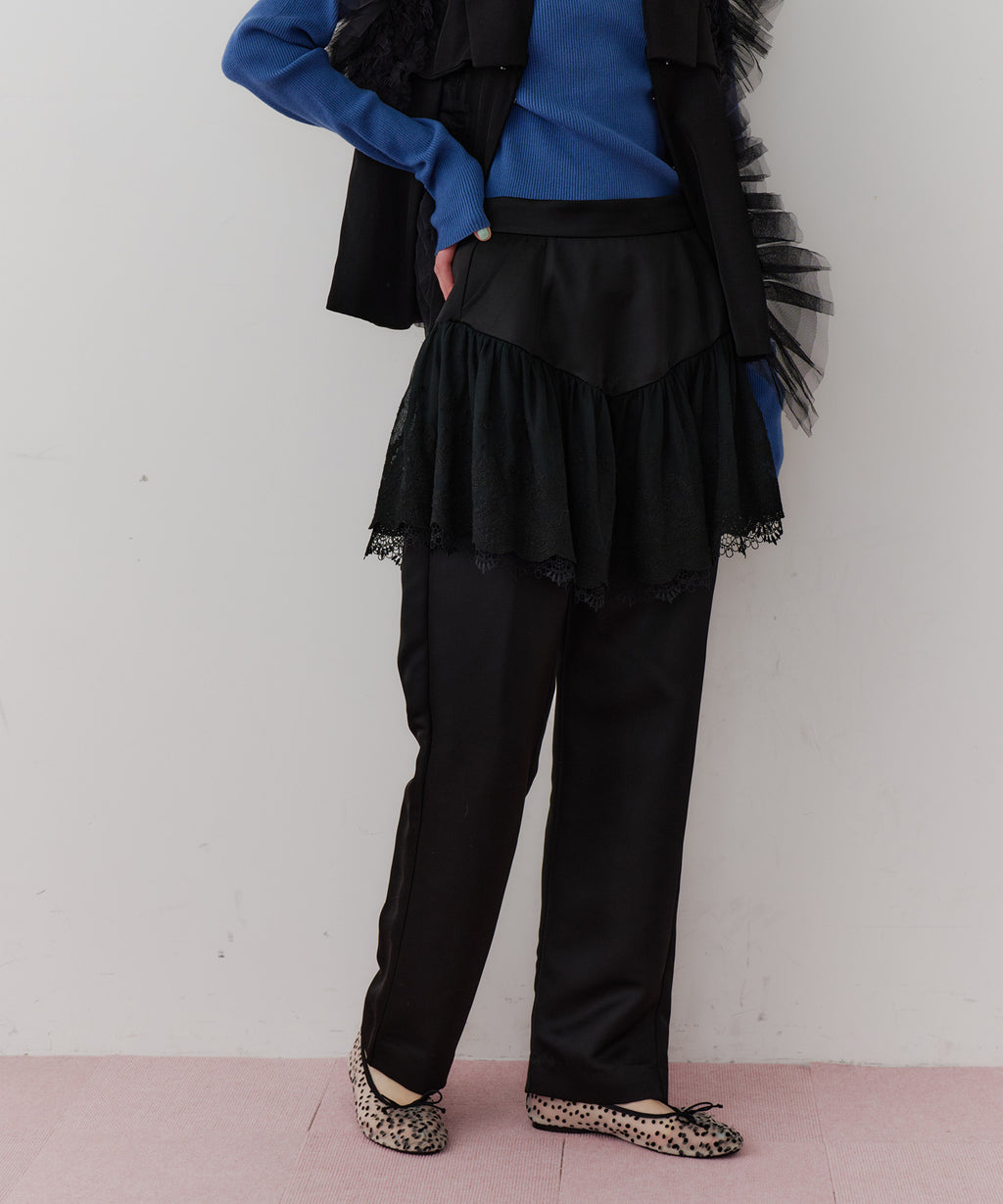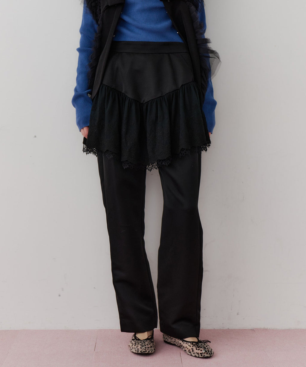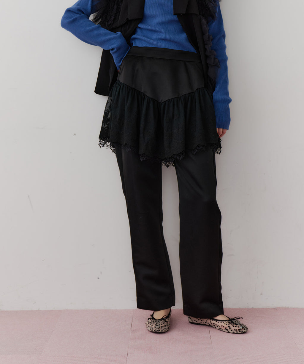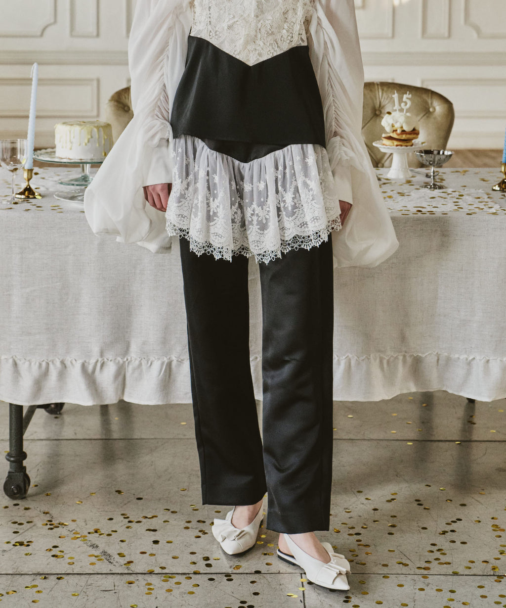 シンプルなストレートパンツにクラシカルレースをドッキング。