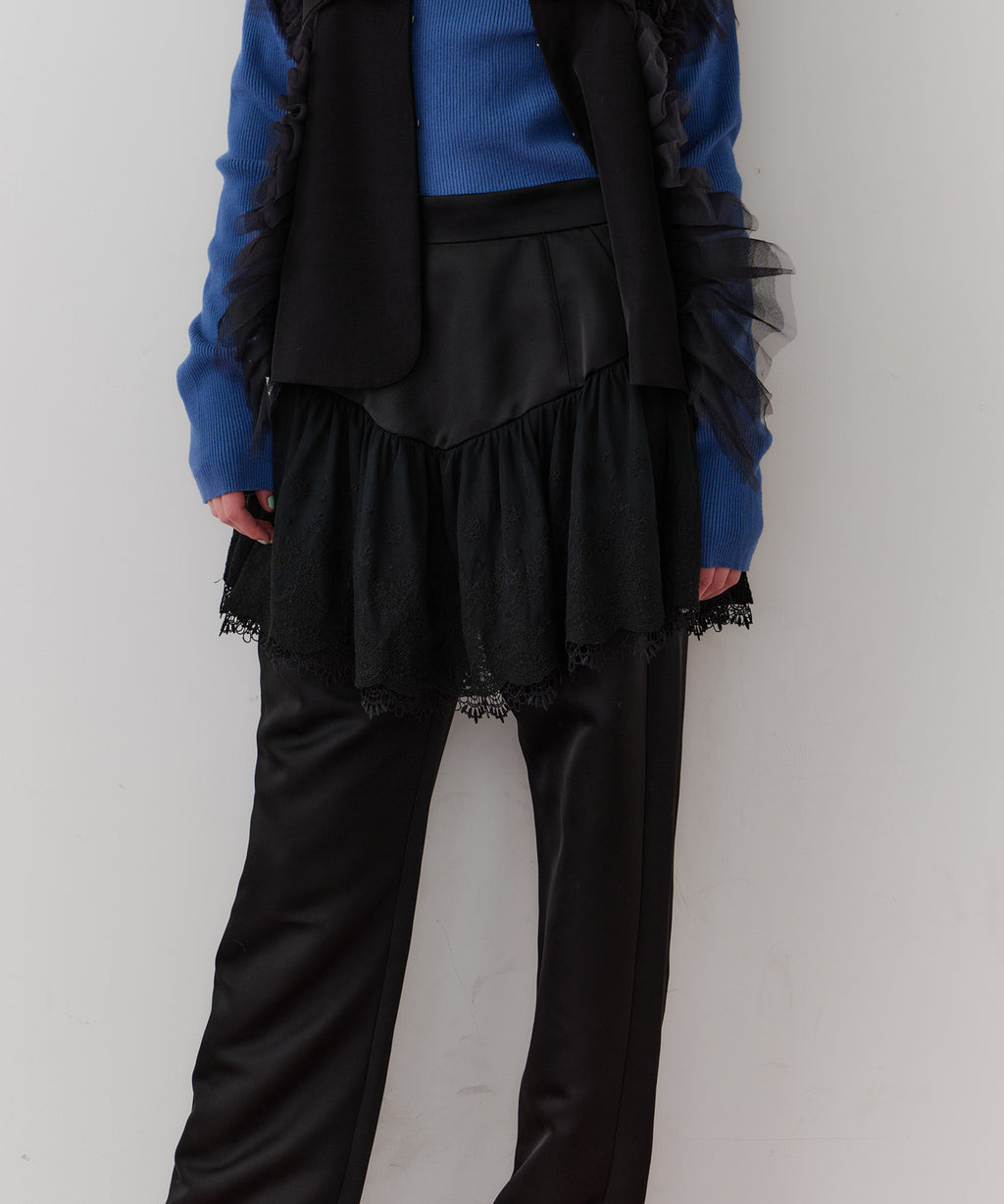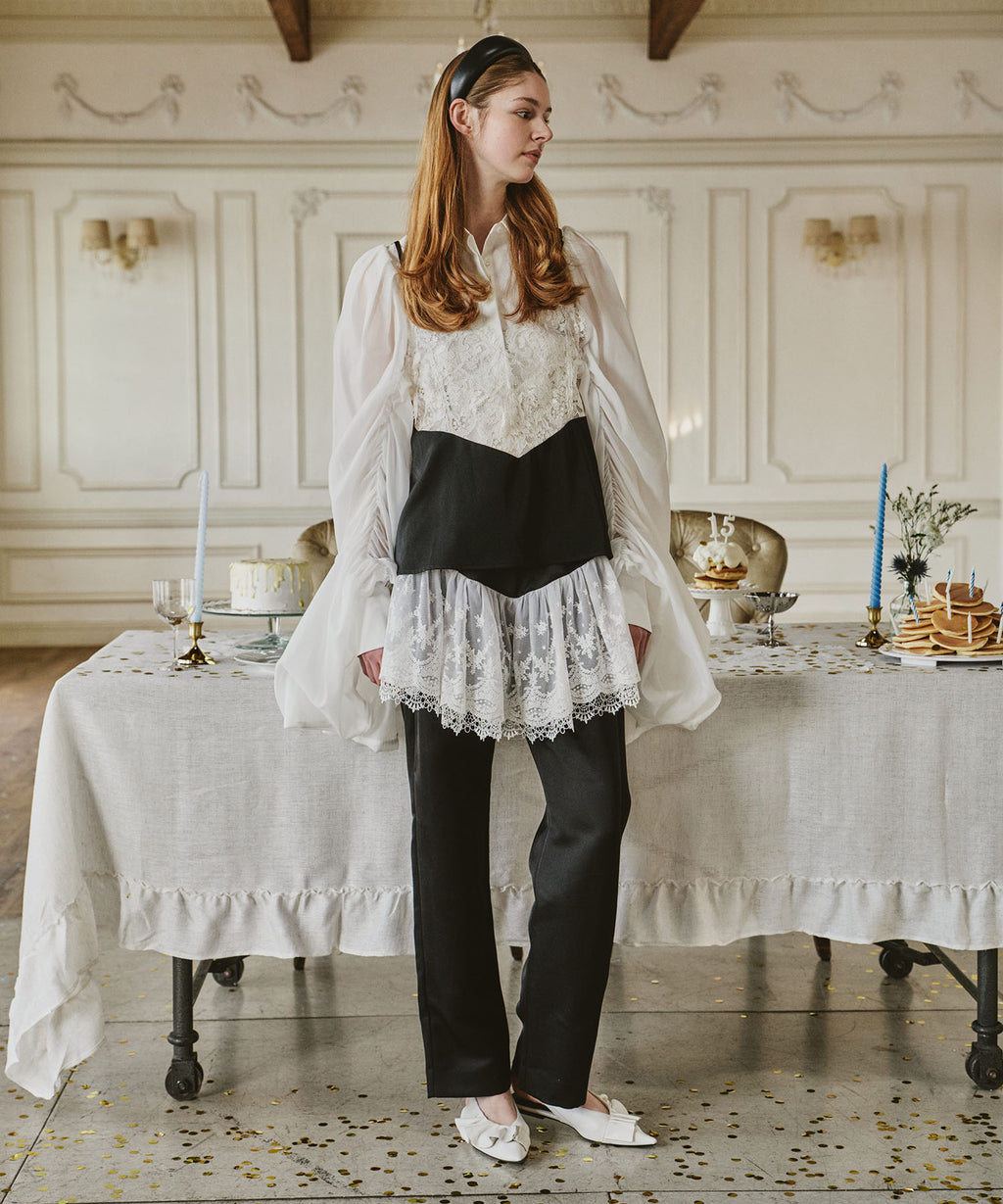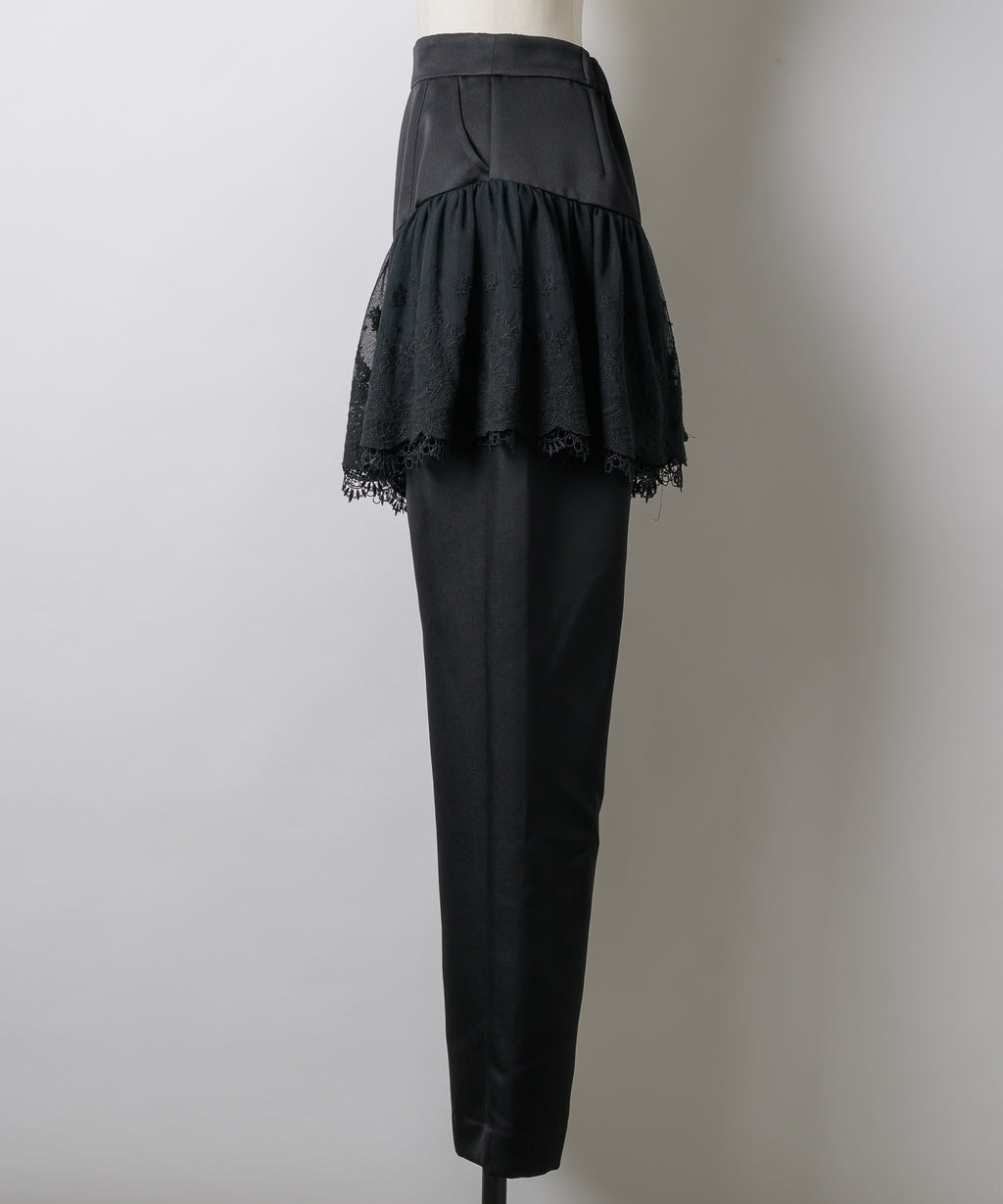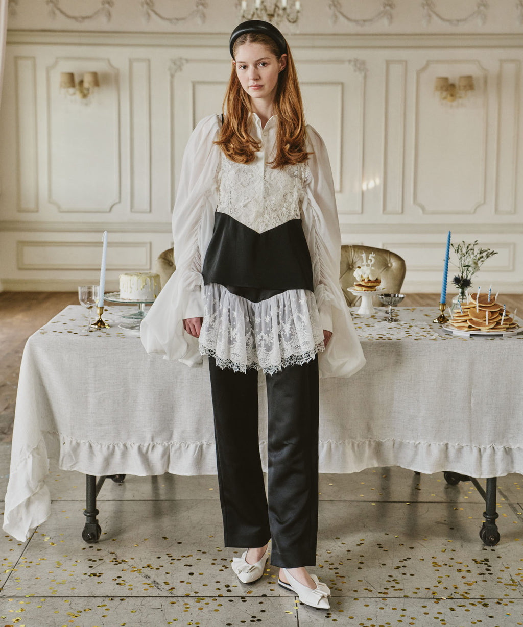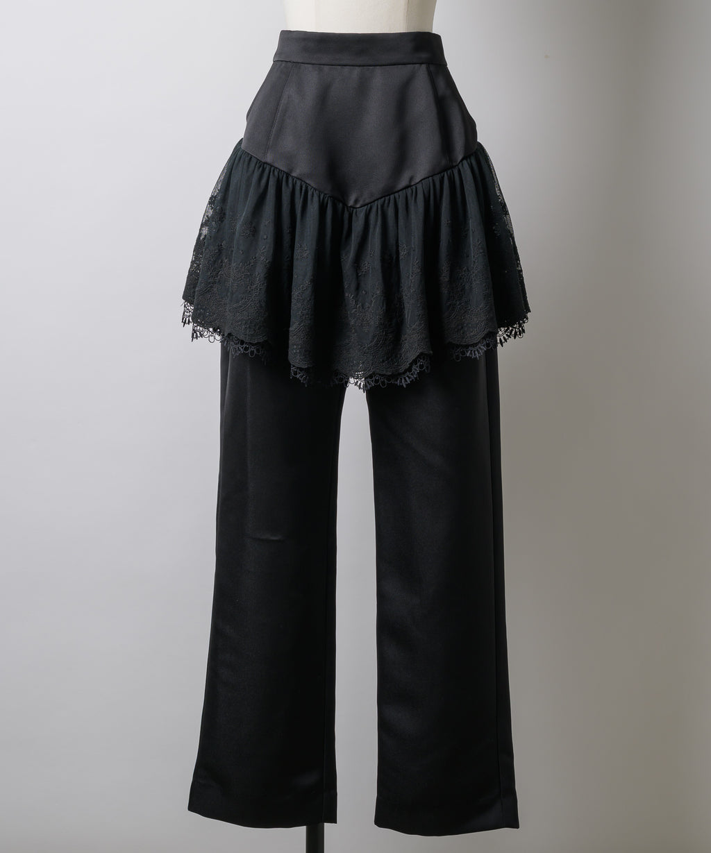 シンプルなストレートパンツにクラシカルレースをドッキング。