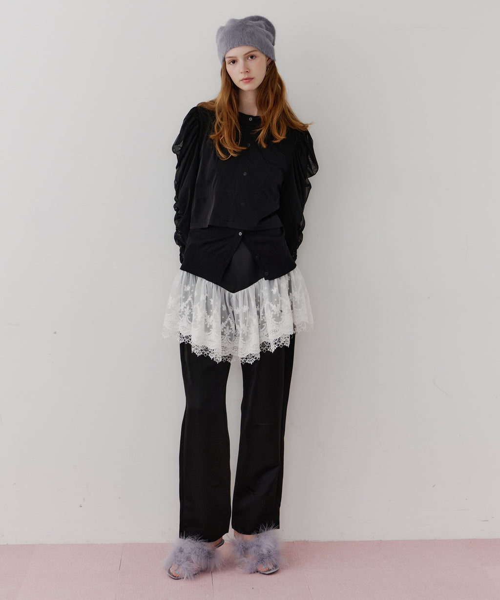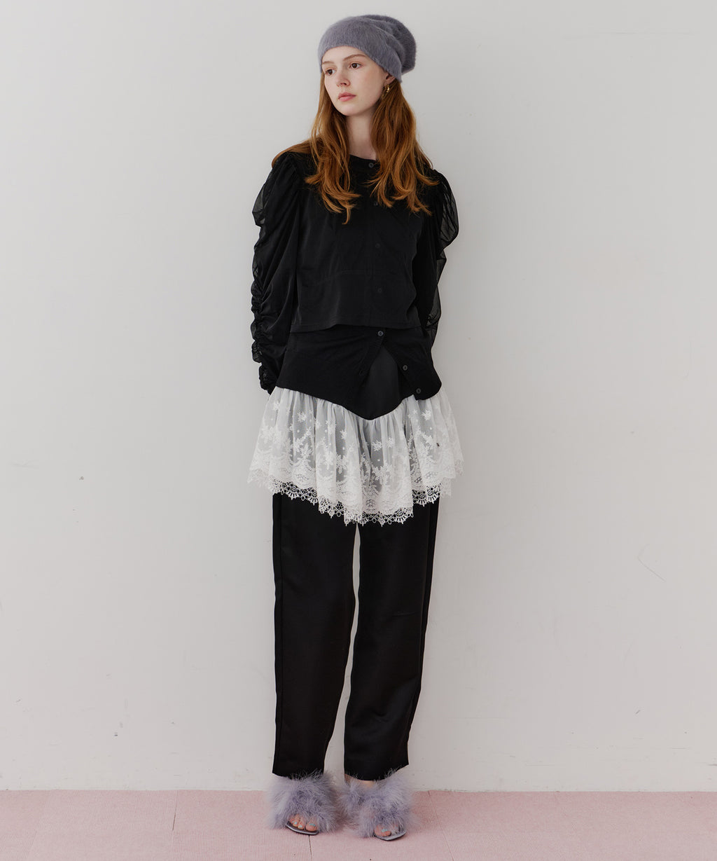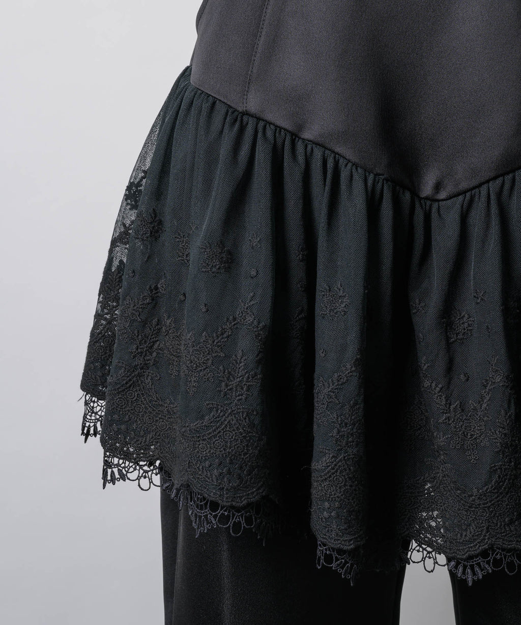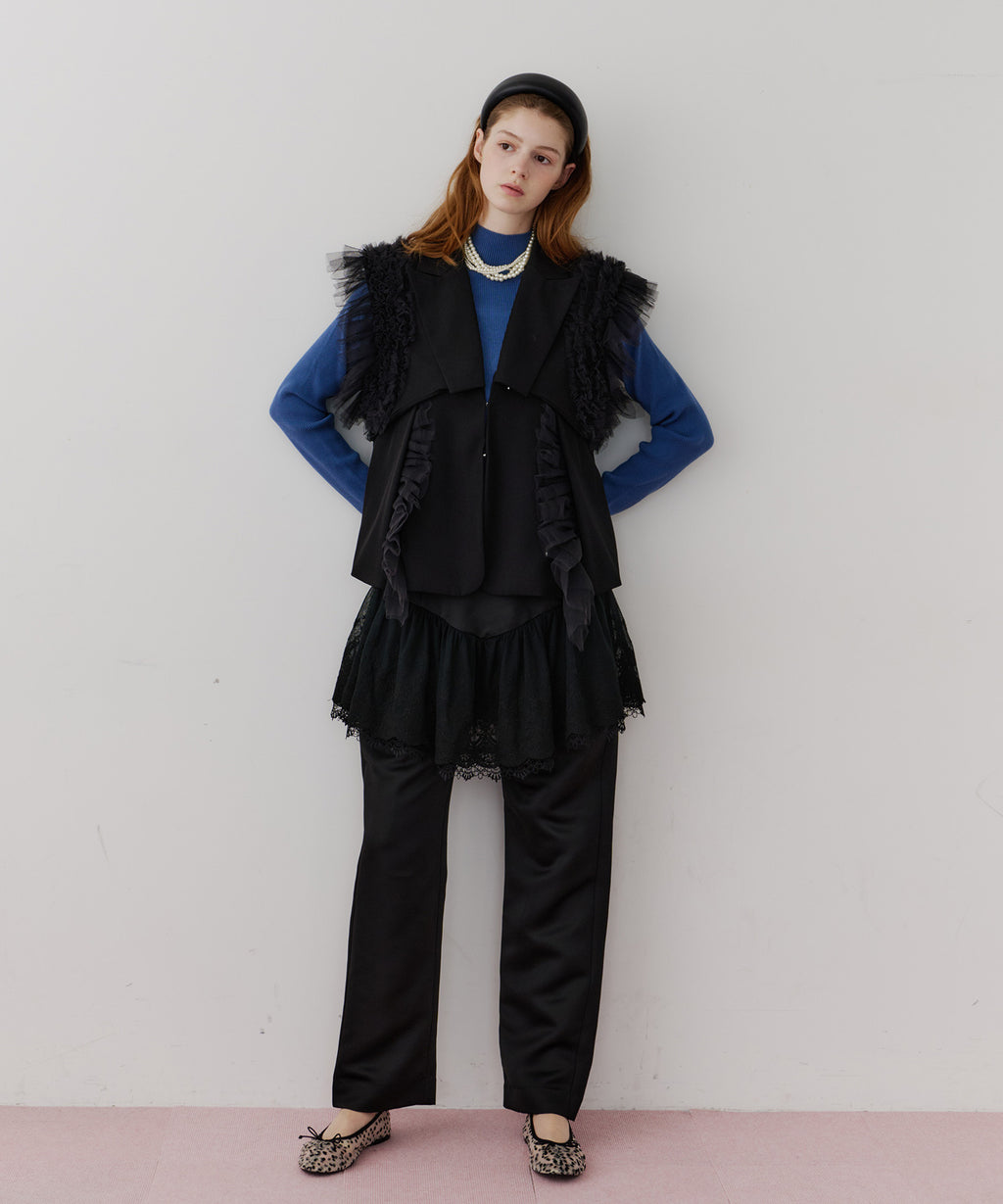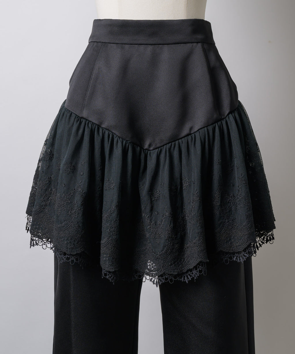 シンプルなストレートパンツにクラシカルレースをドッキング。