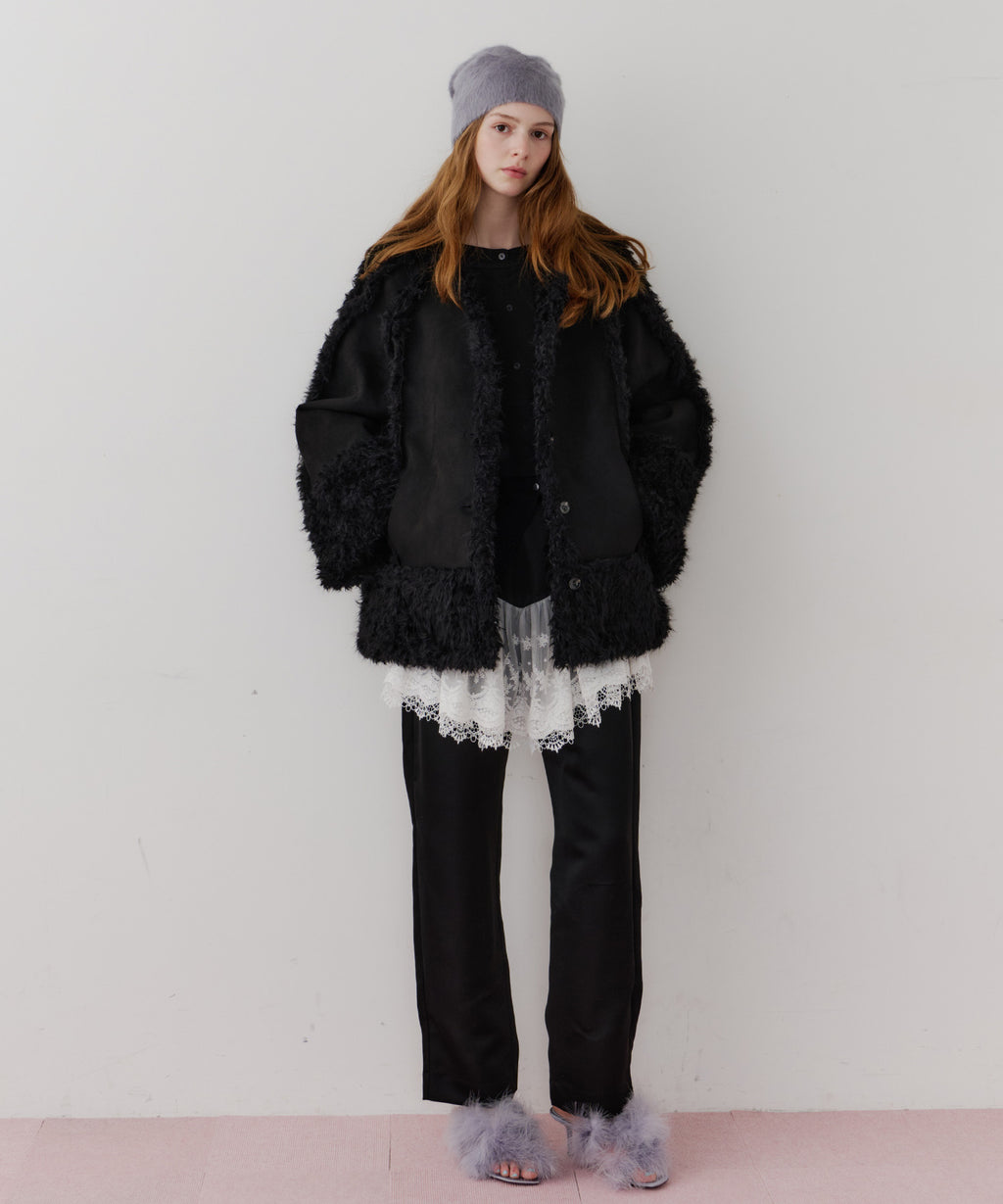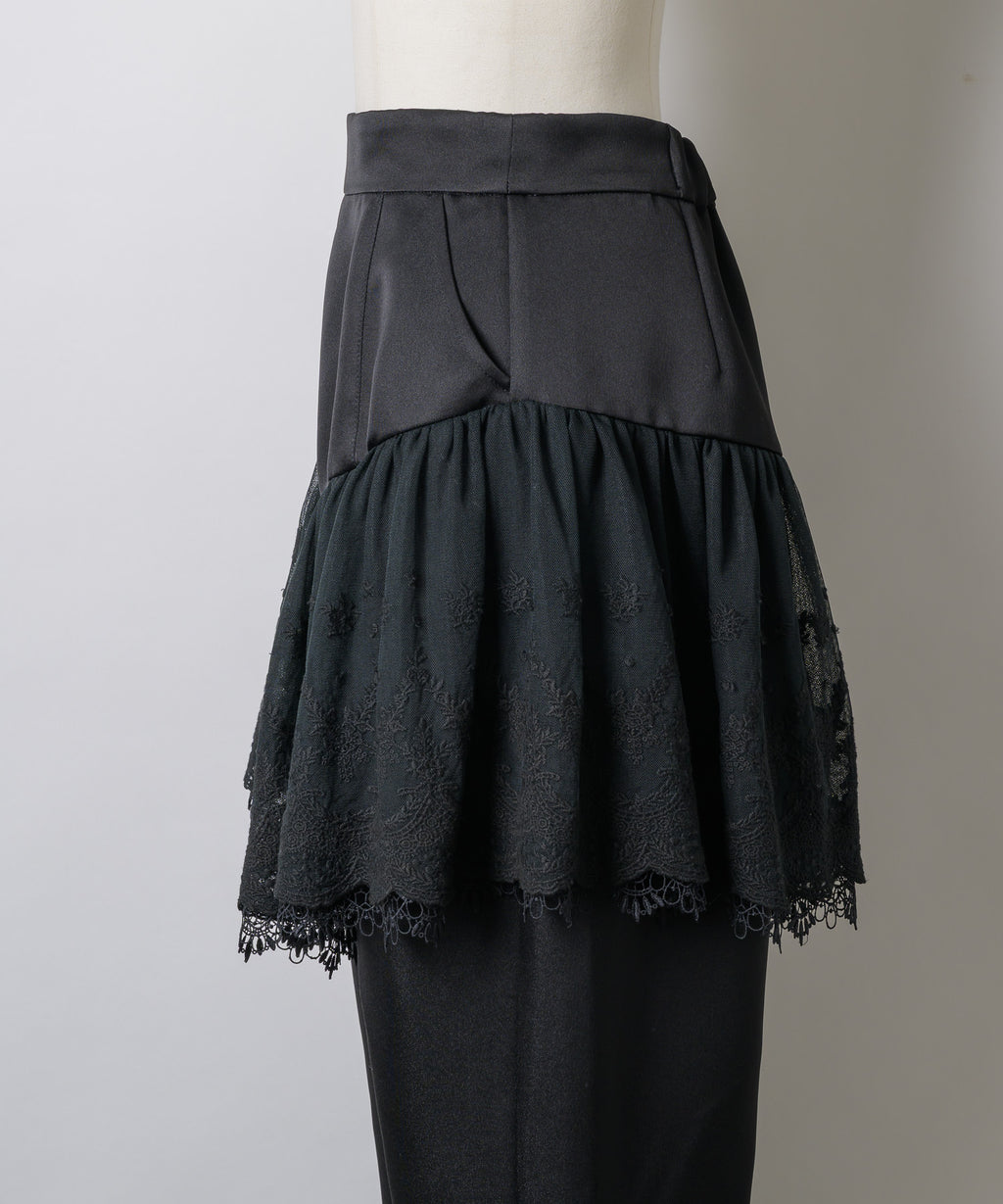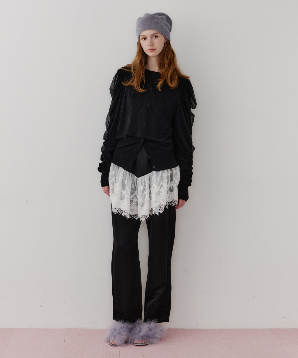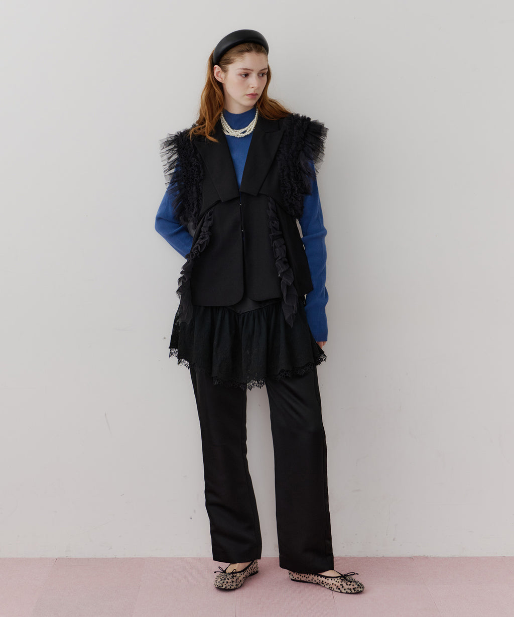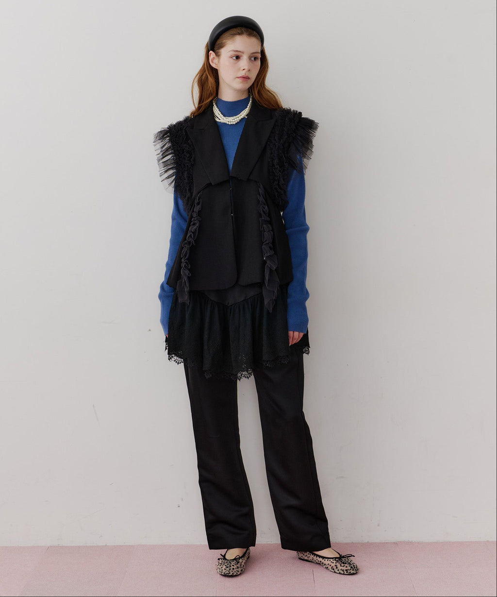 シンプルなストレートパンツにクラシカルレースをドッキング。