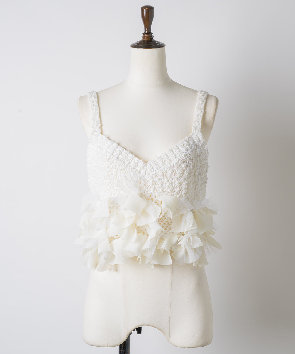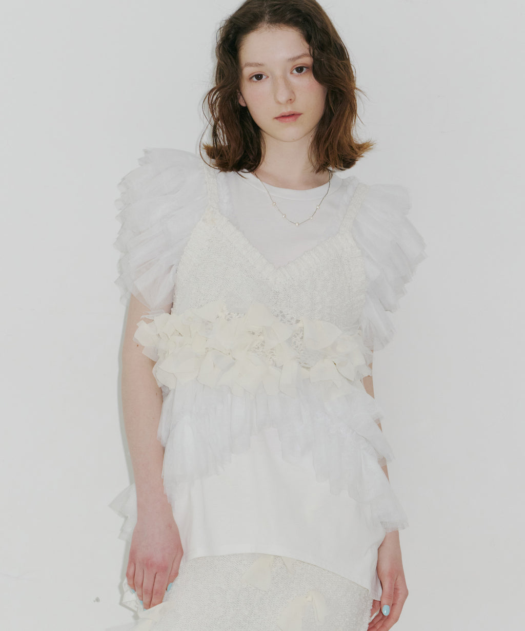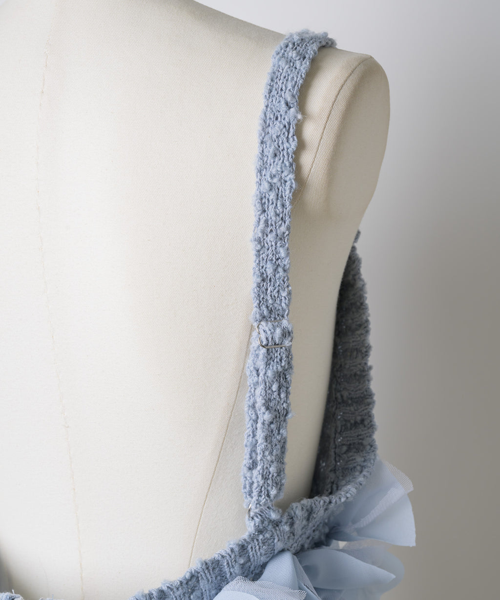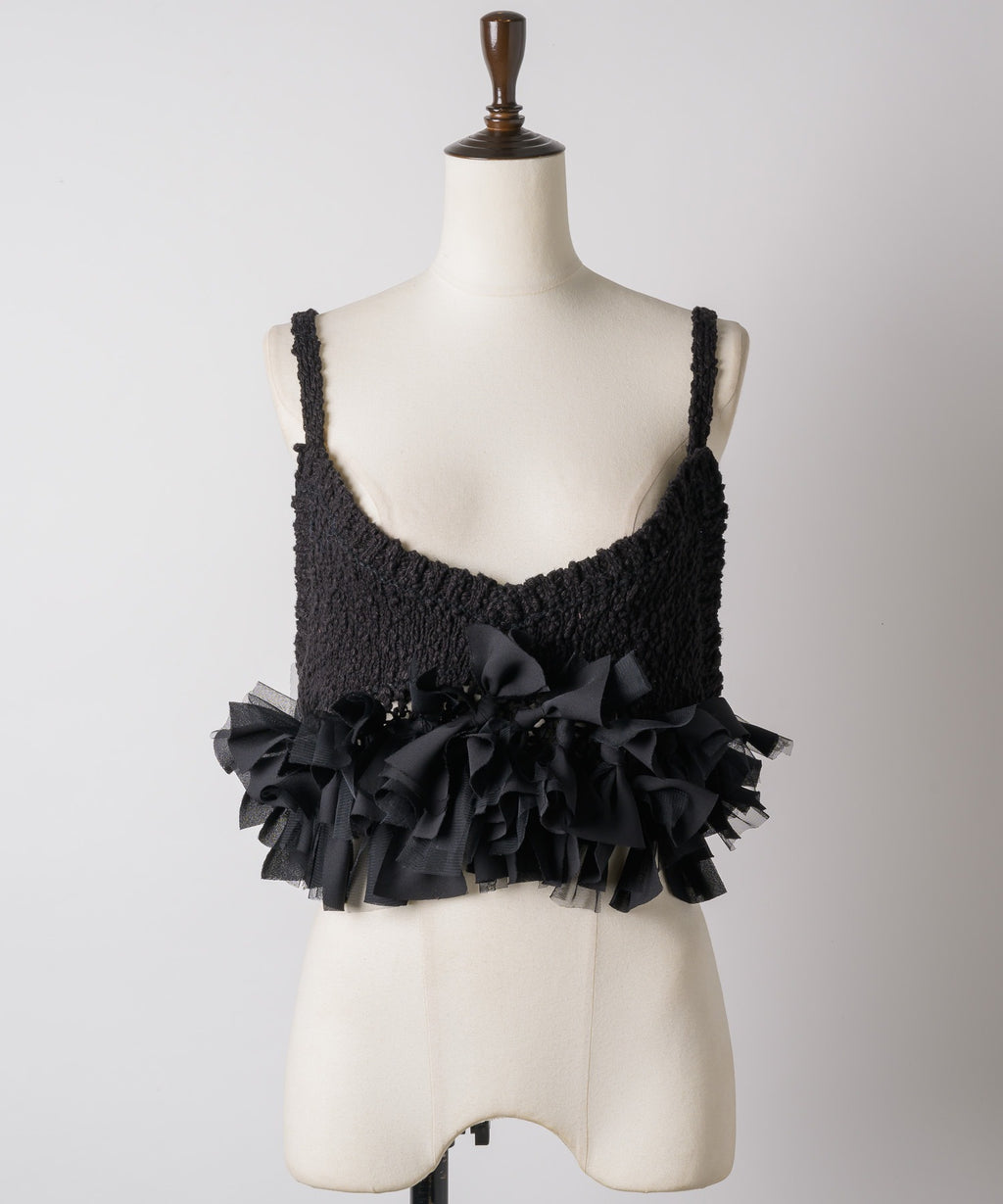 メッシュ柄に編んだニット部分に、短冊状にカットしたチュールとシフォンを通して1つ1つ手で結んでリボンをつけています◎