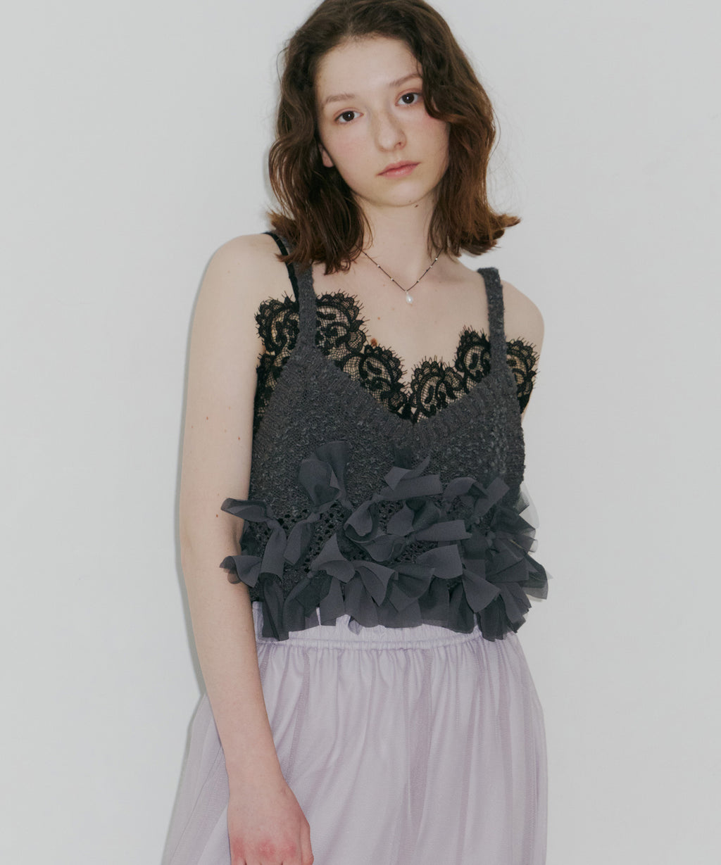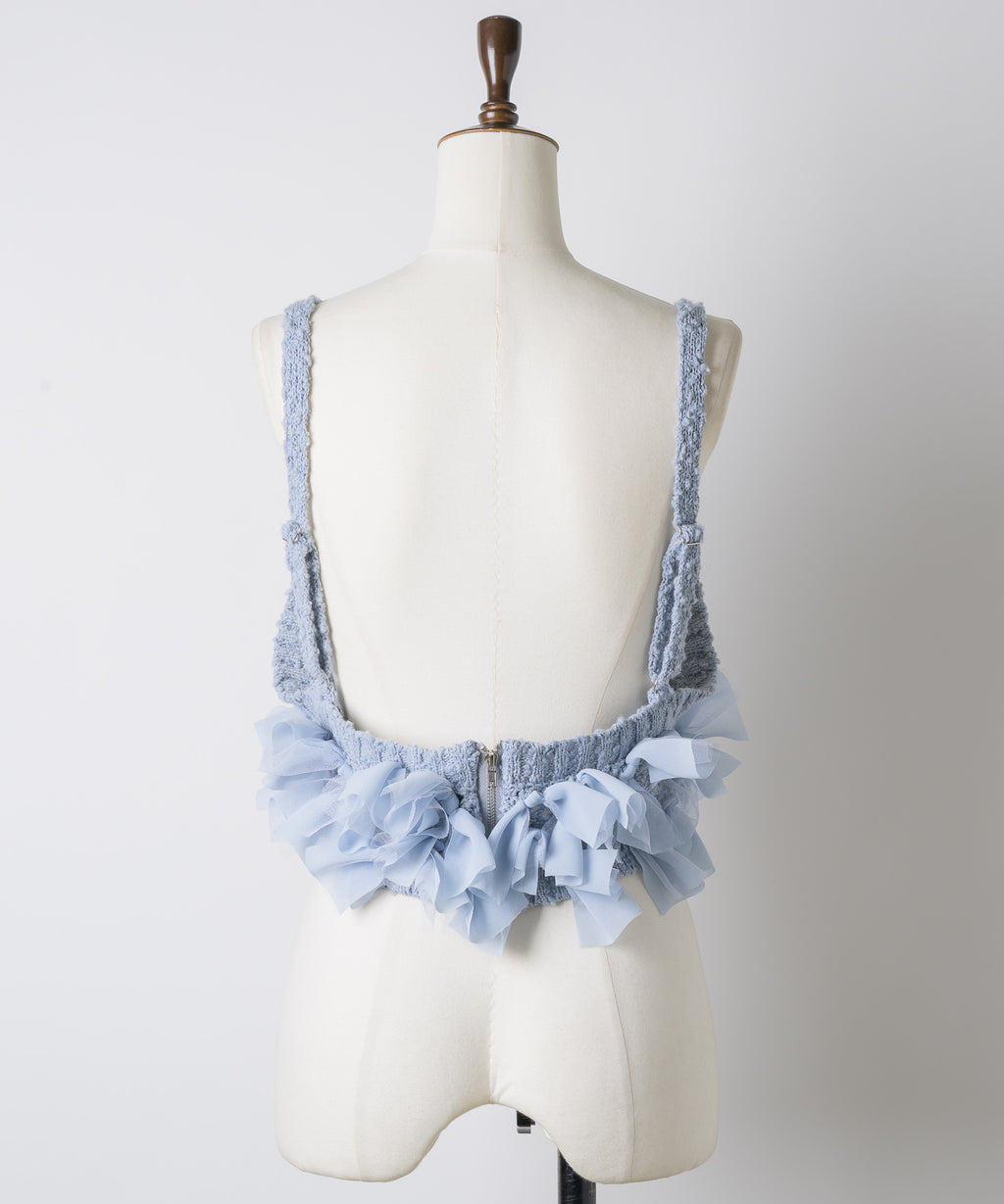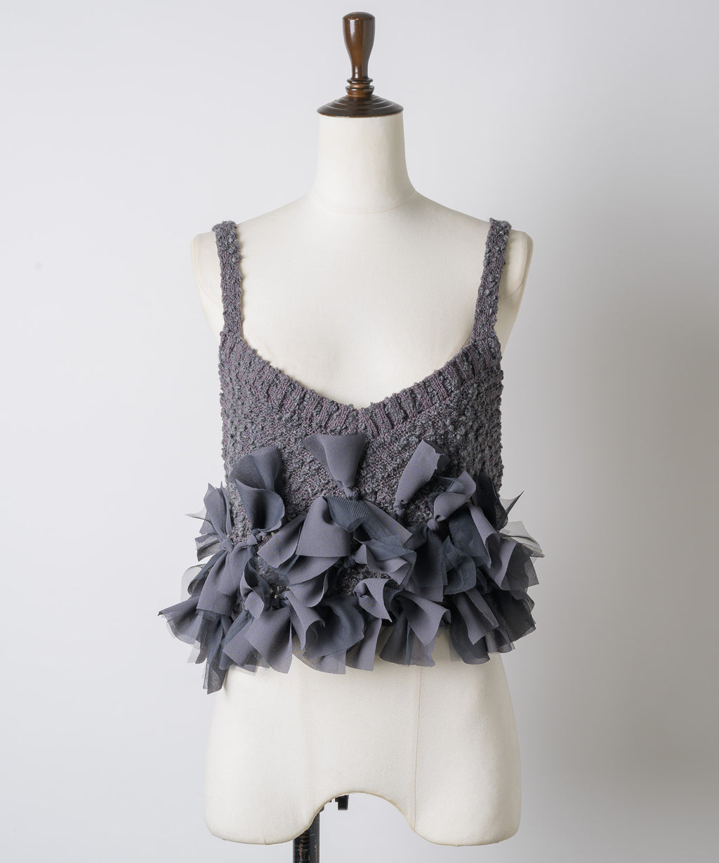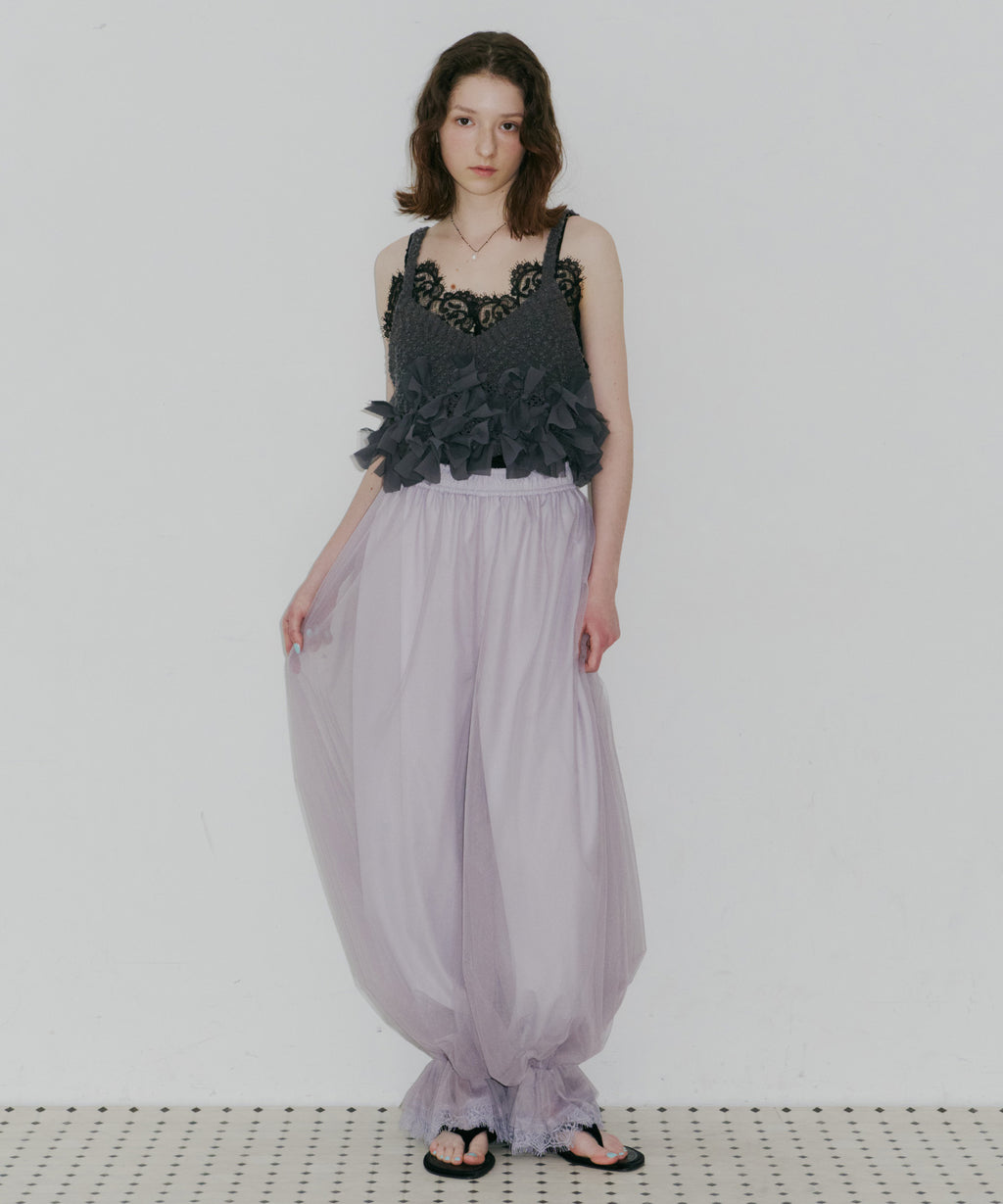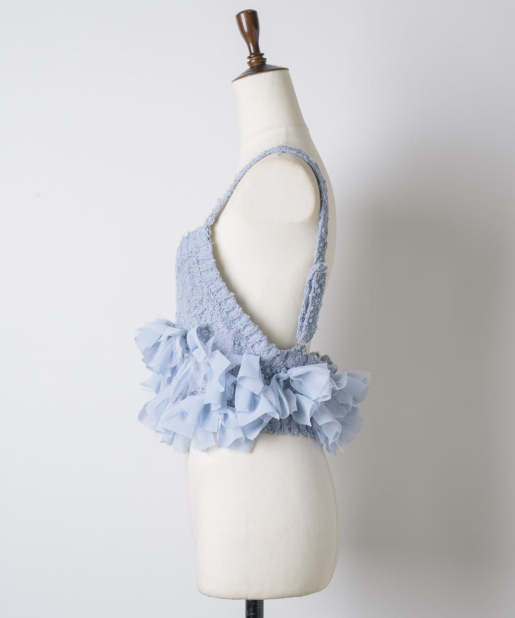 メッシュ柄に編んだニット部分に、短冊状にカットしたチュールとシフォンを通して1つ1つ手で結んでリボンをつけています◎