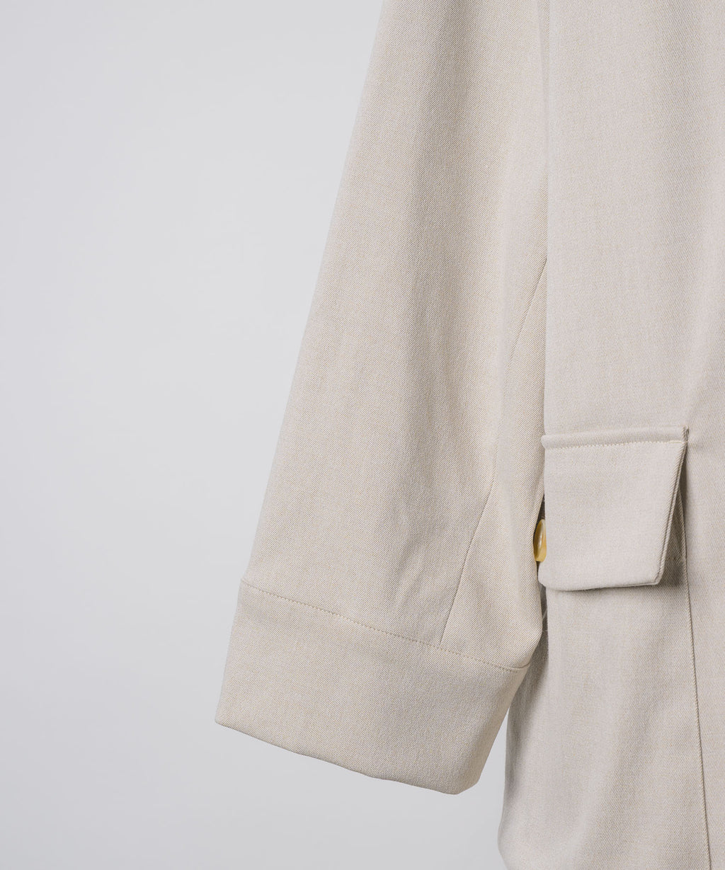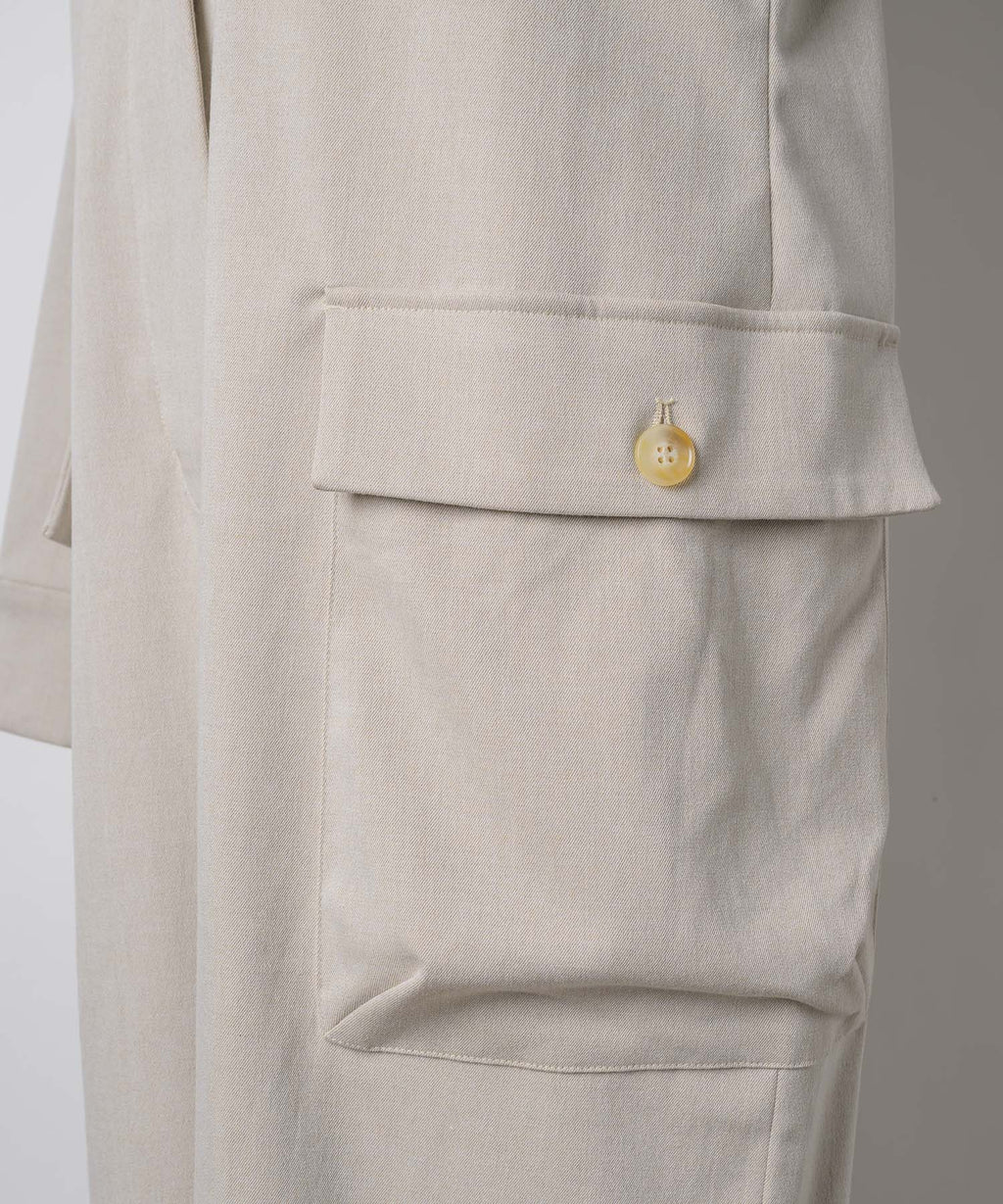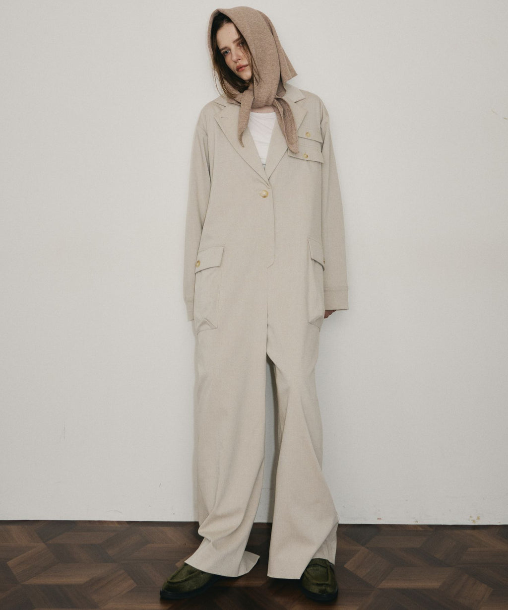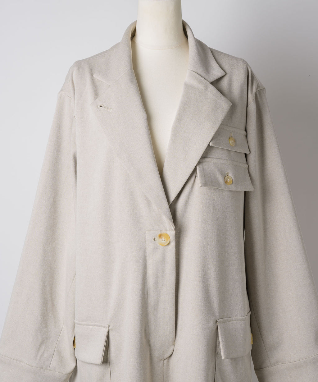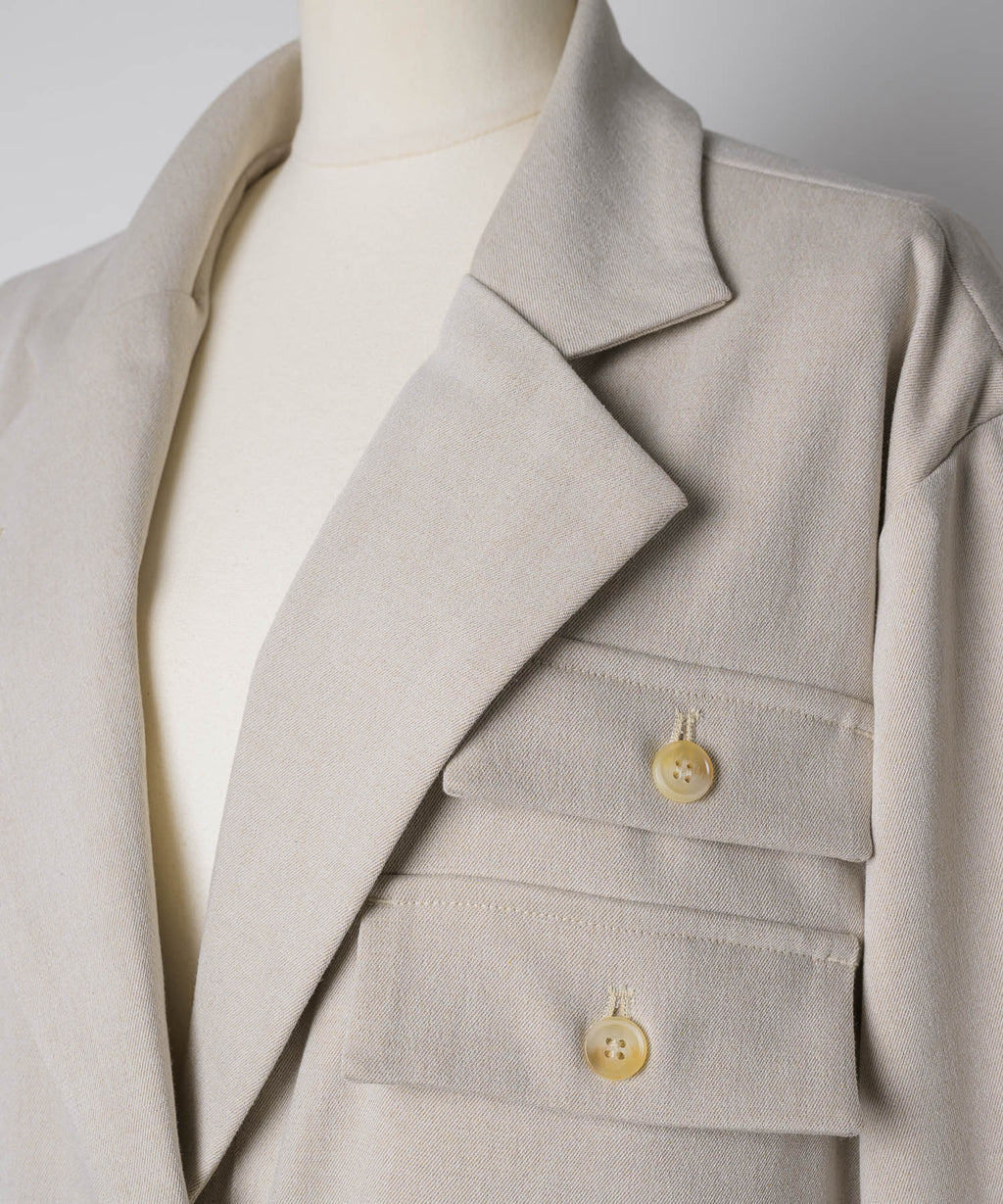 胸元のダブルフラップやラペルボタンなど、遊び心もプラス。