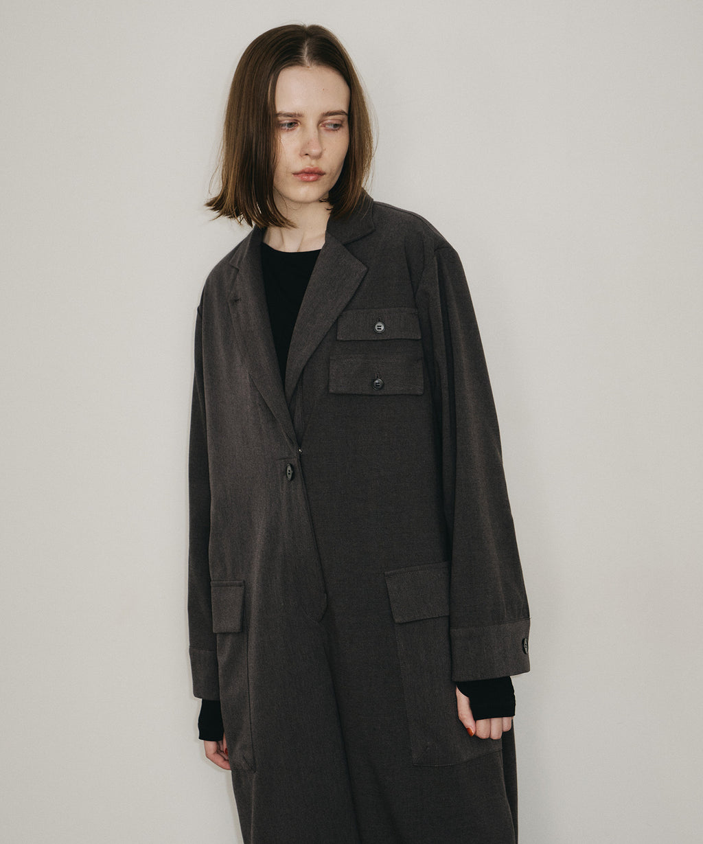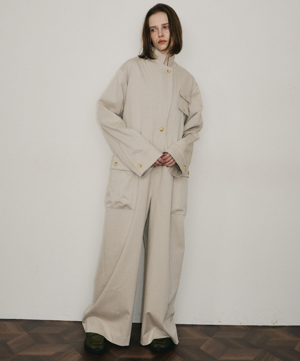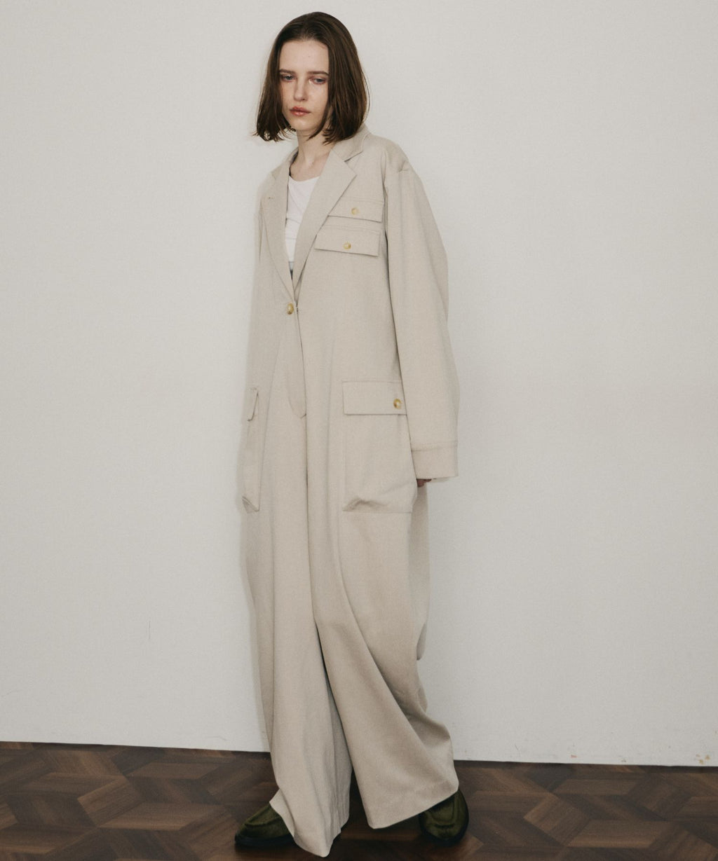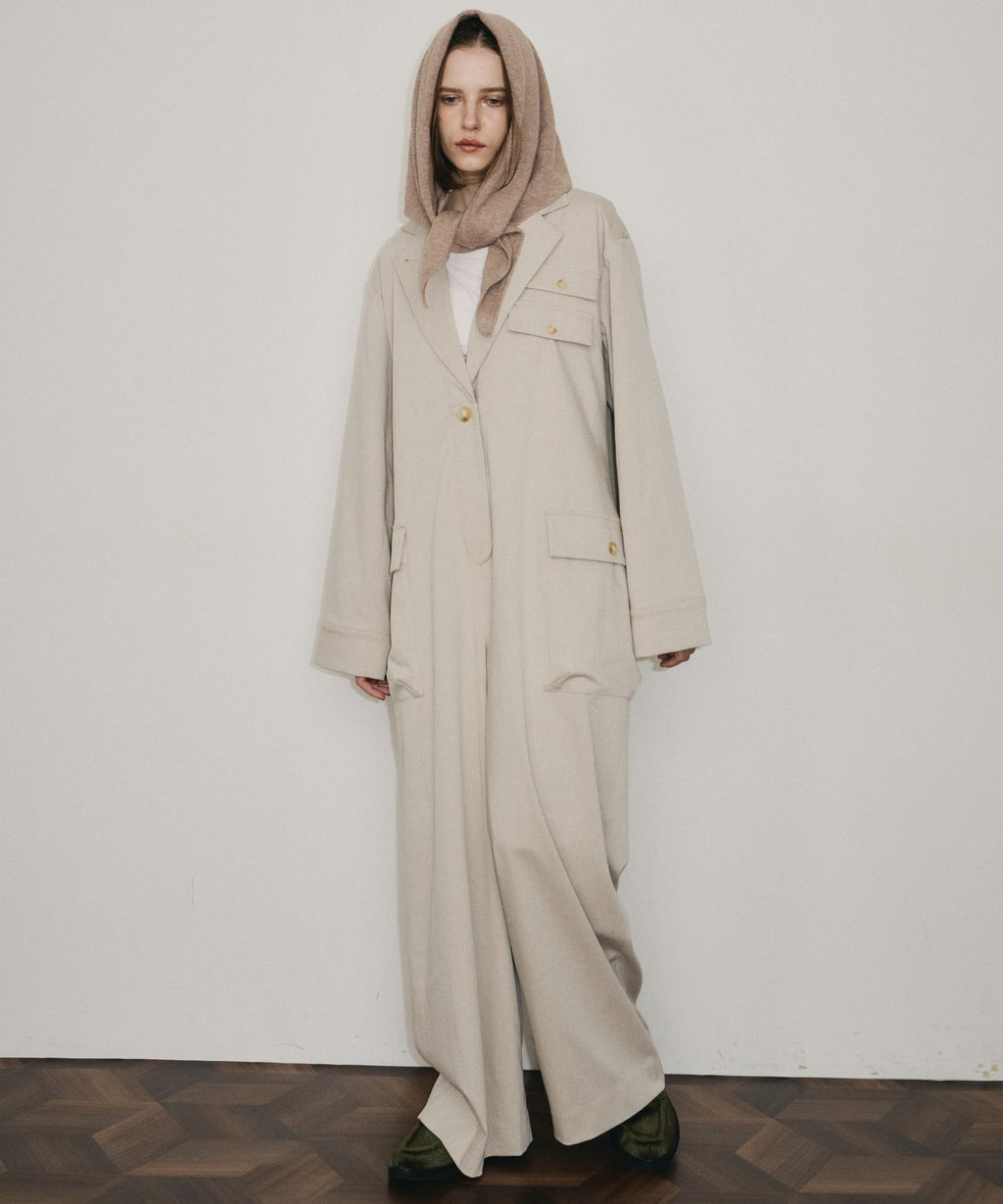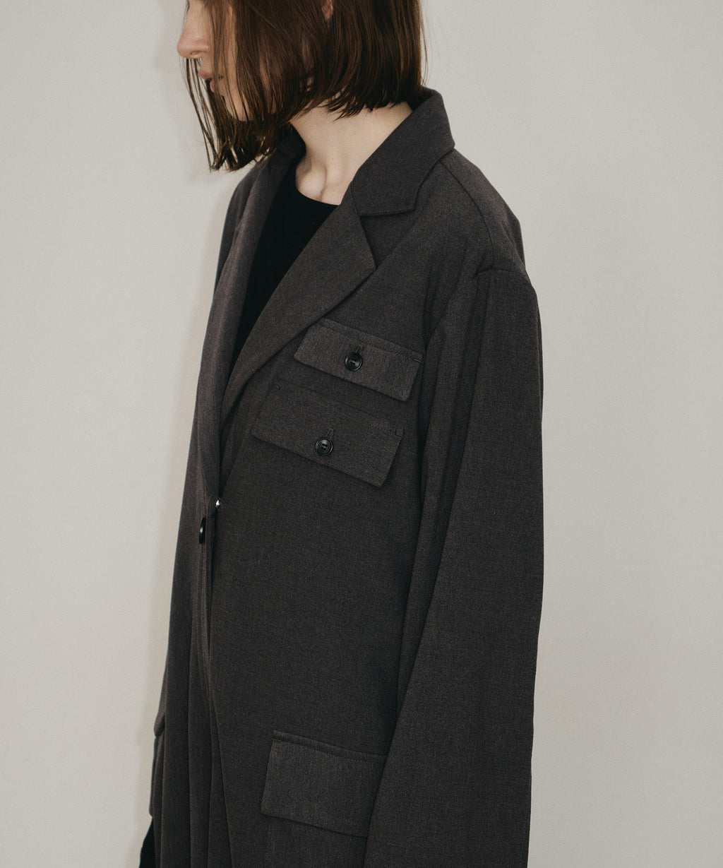 胸元のダブルフラップやラペルボタンなど、遊び心もプラス。