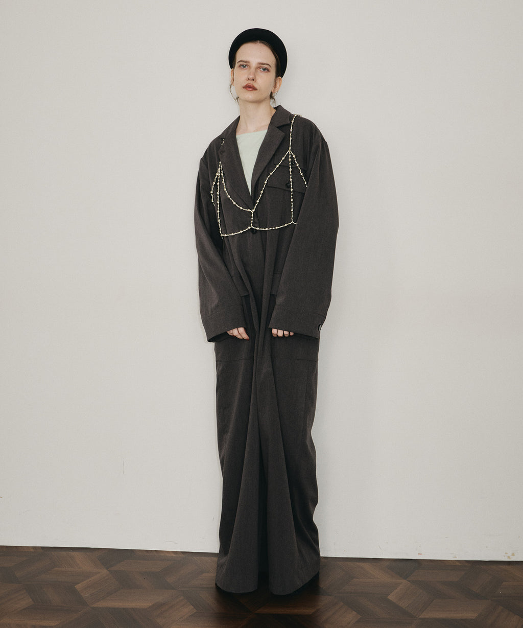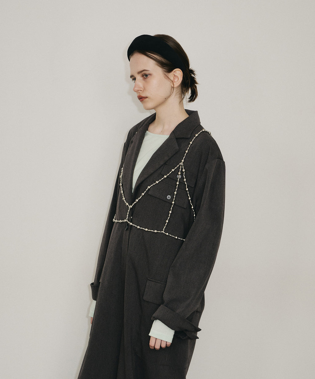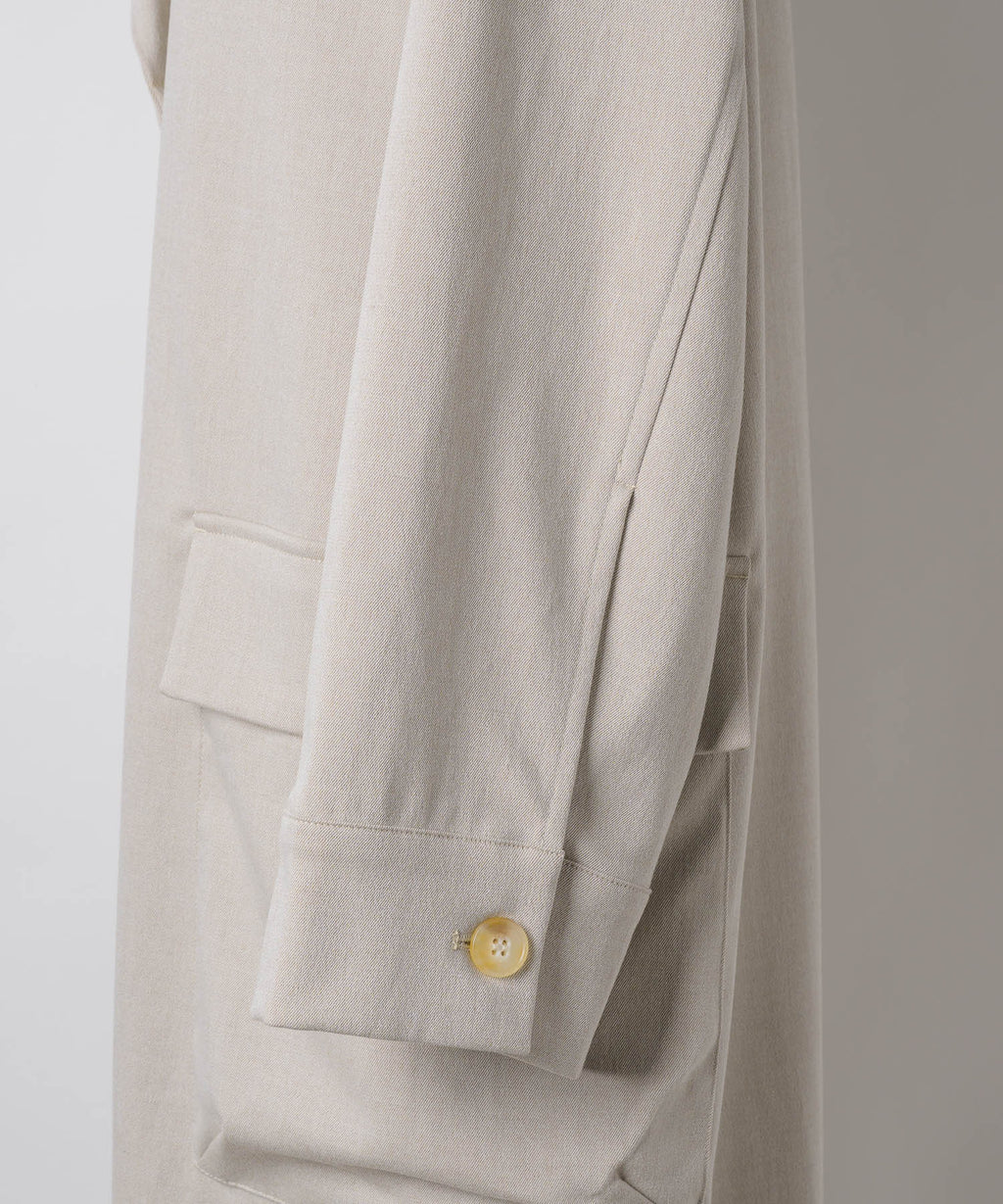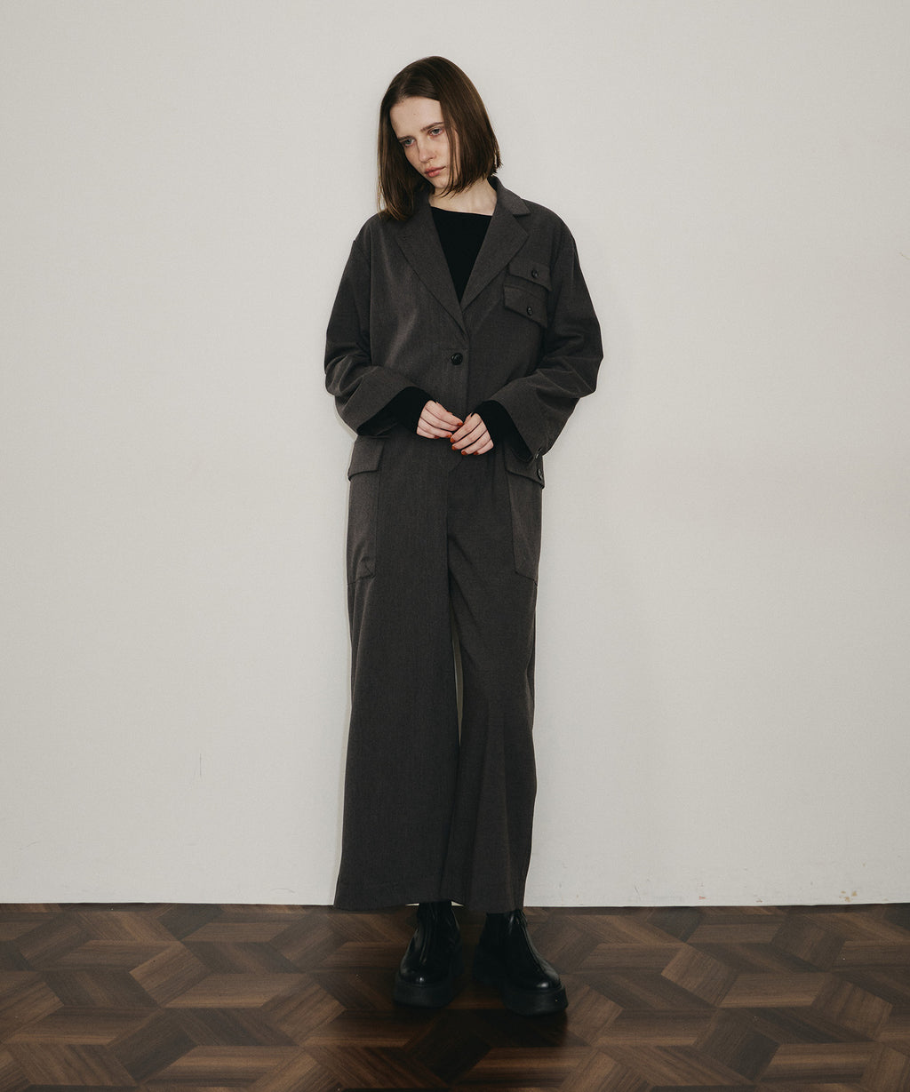 胸元のダブルフラップやラペルボタンなど、遊び心もプラス。
