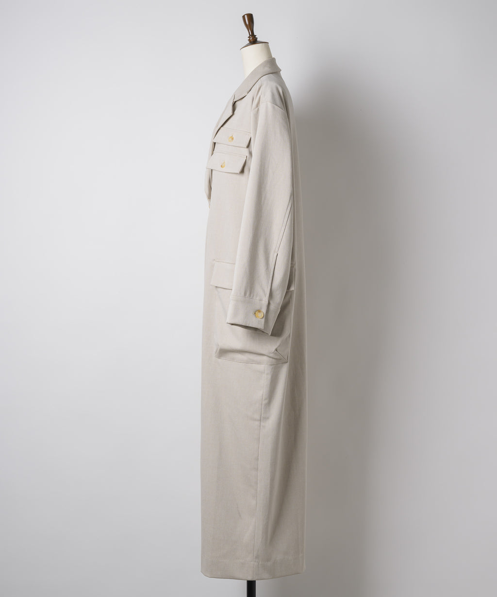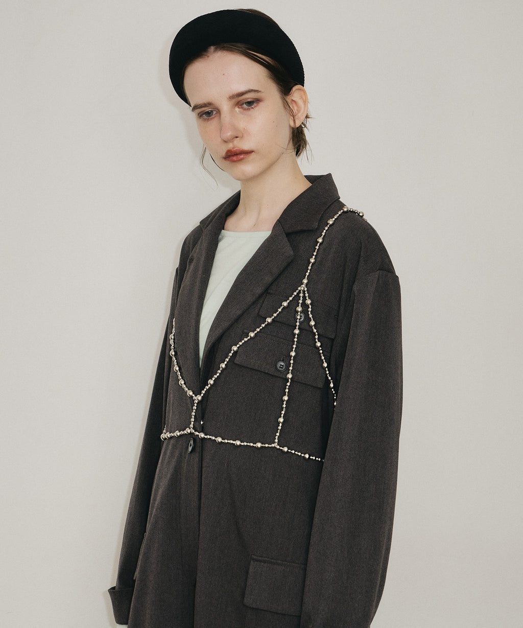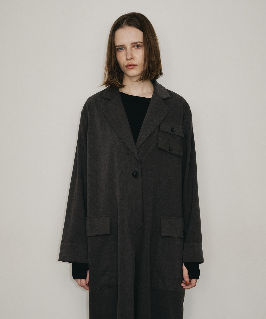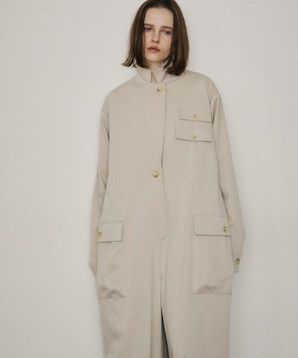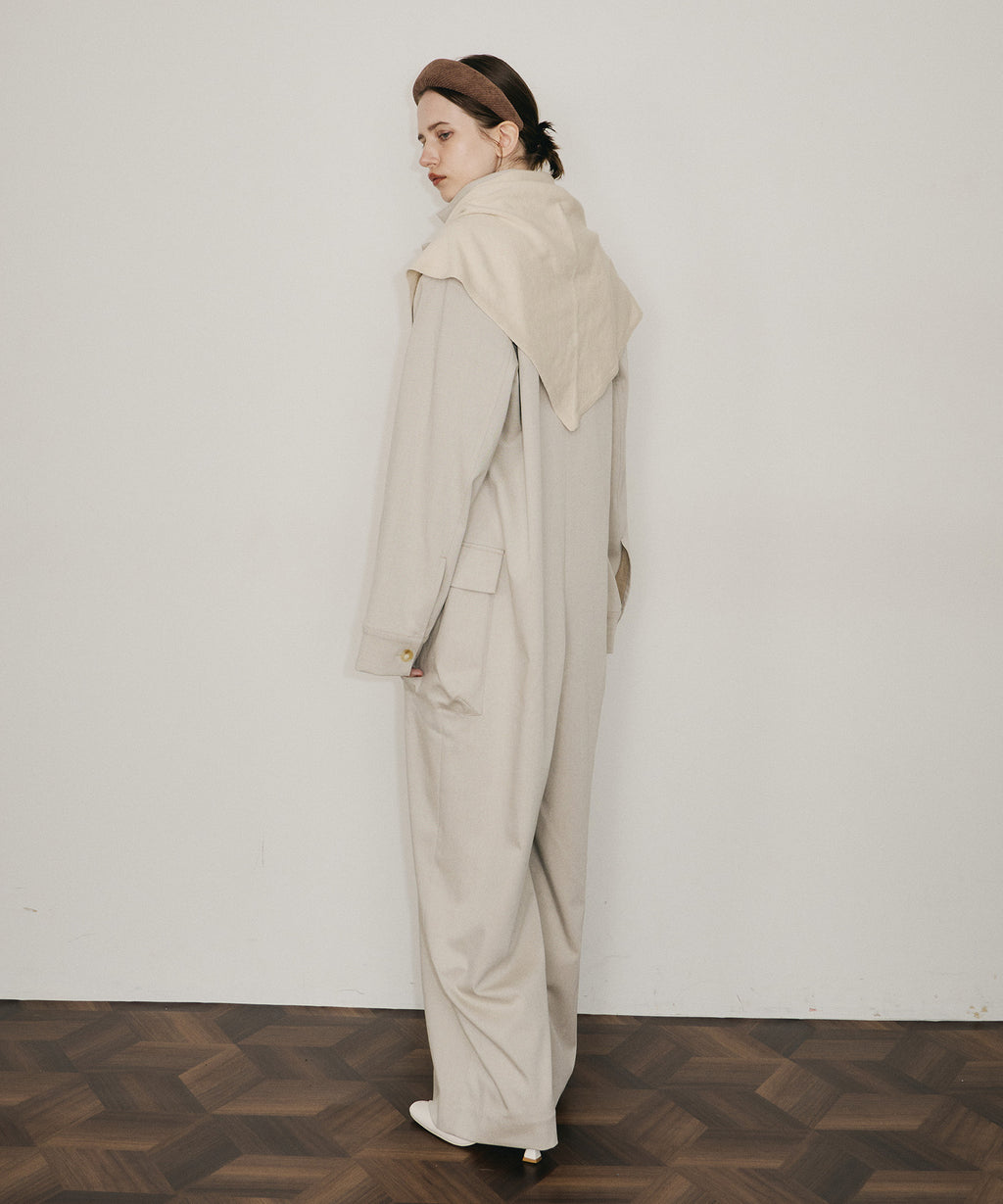 胸元のダブルフラップやラペルボタンなど、遊び心もプラス。
