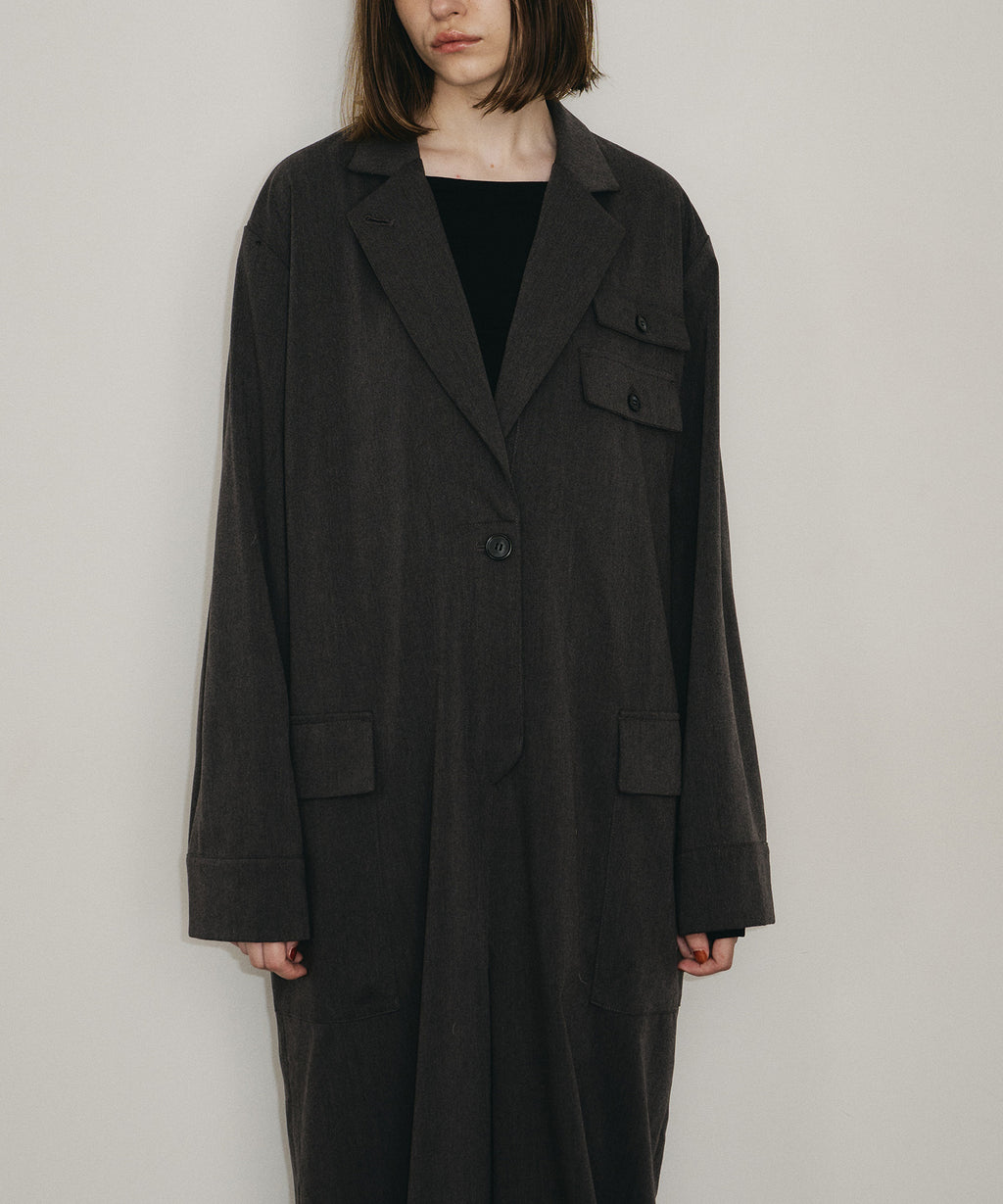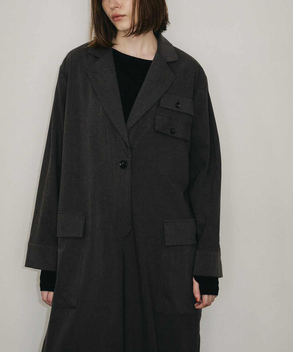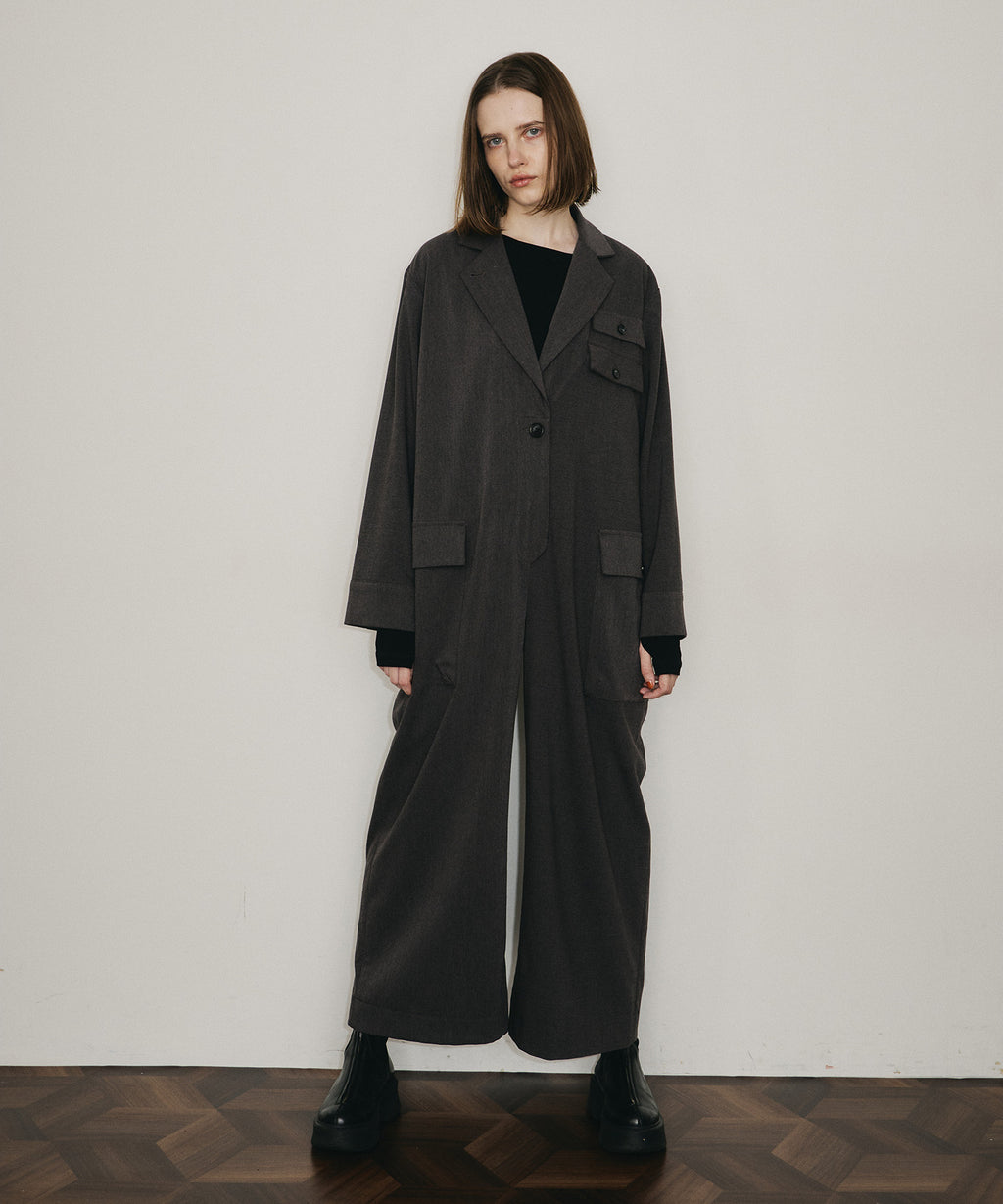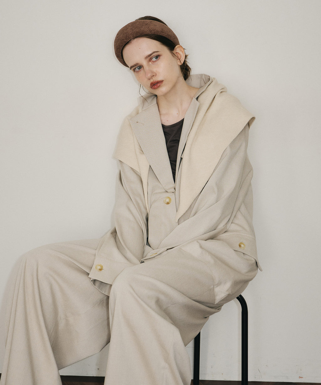 ラペルボタンを留めるとよりモードな印象に。腰で巻いてトップスを見せても◎