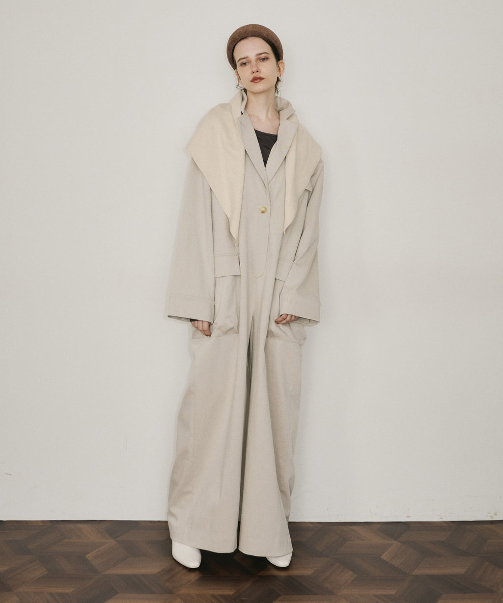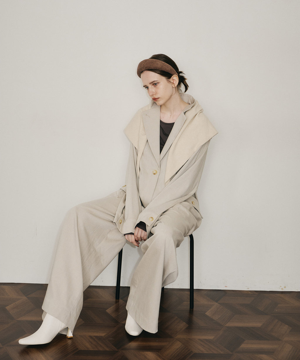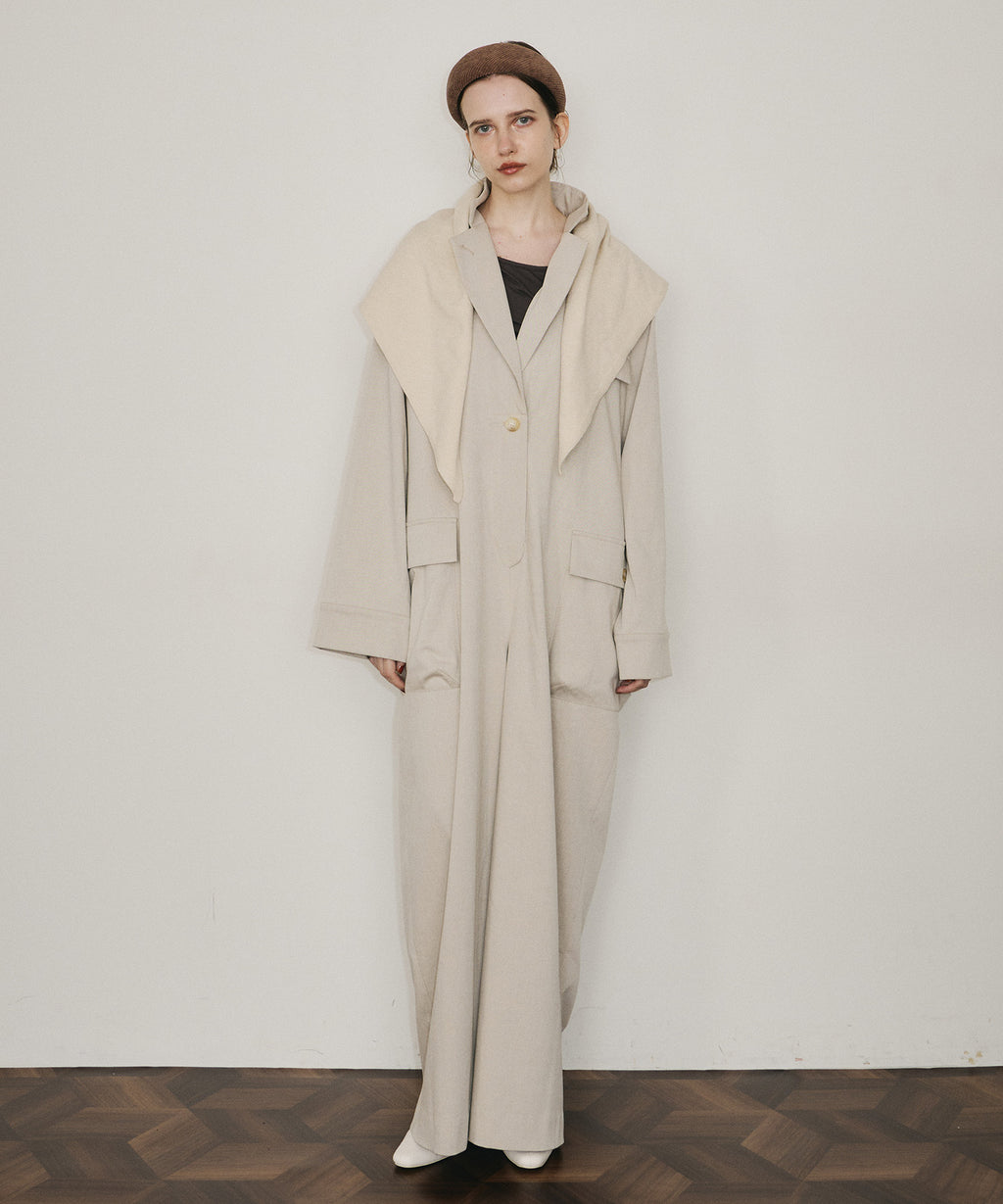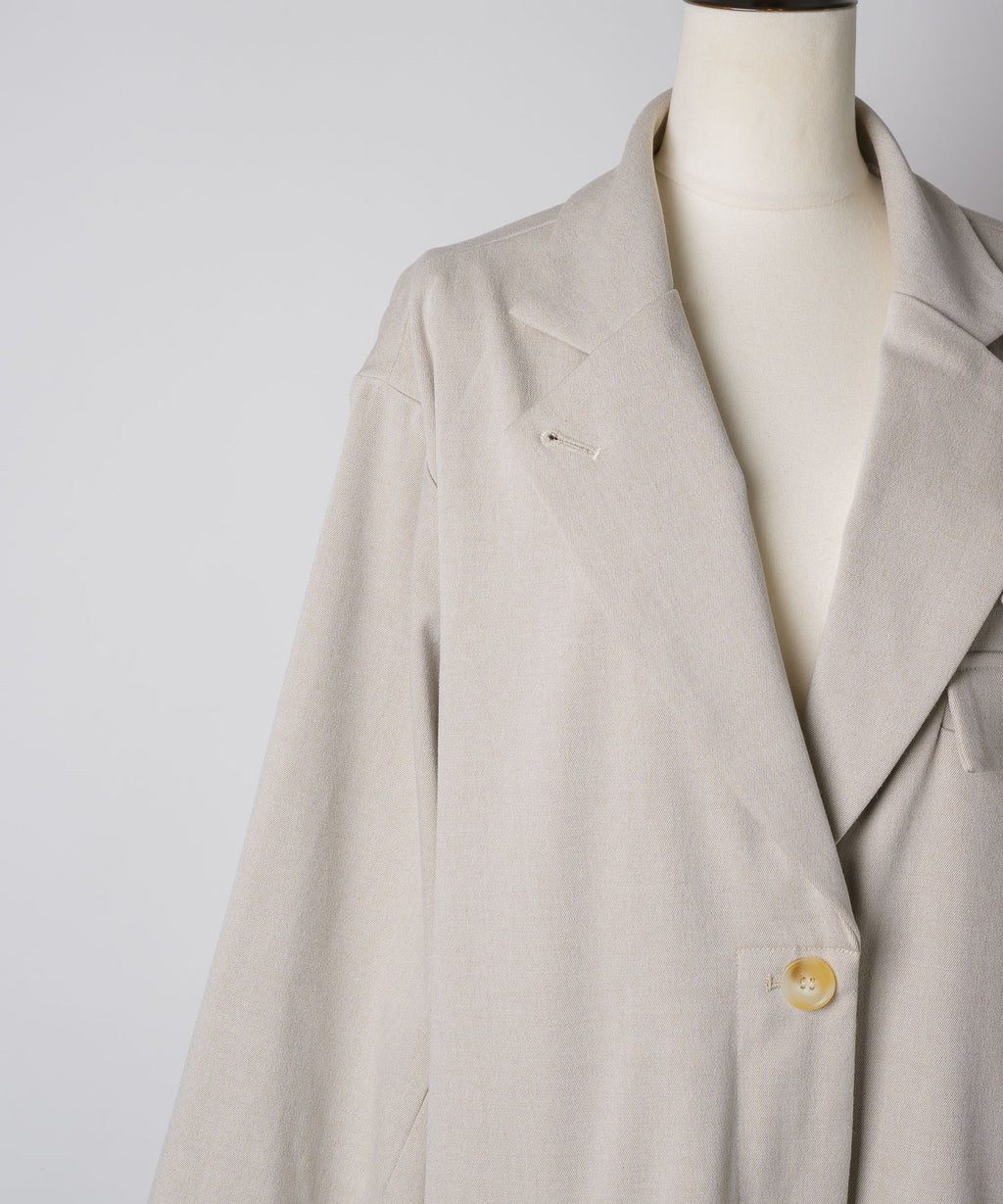 ラペルボタンを留めるとよりモードな印象に。腰で巻いてトップスを見せても◎