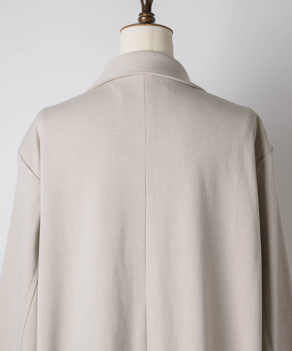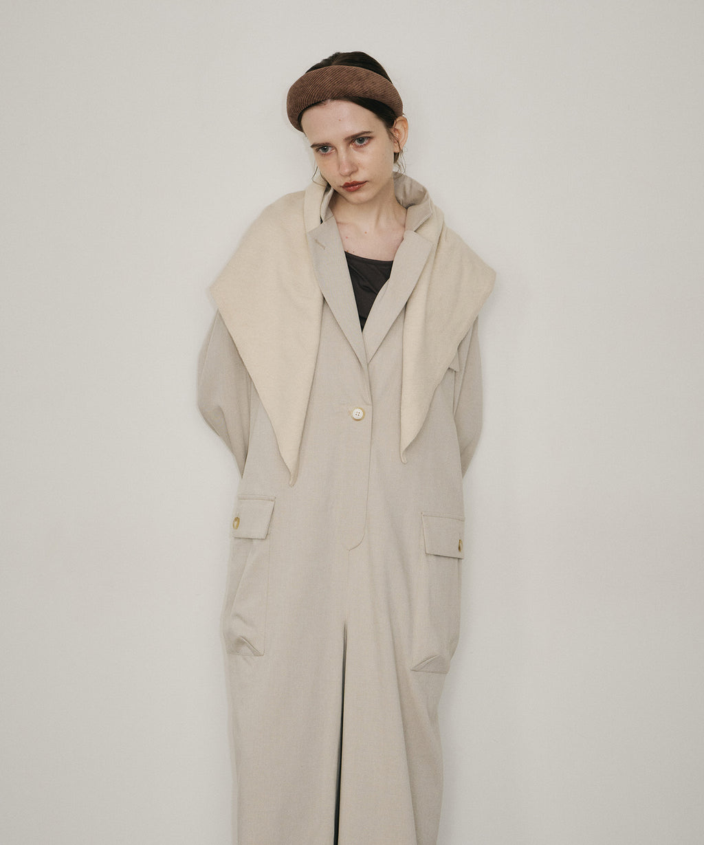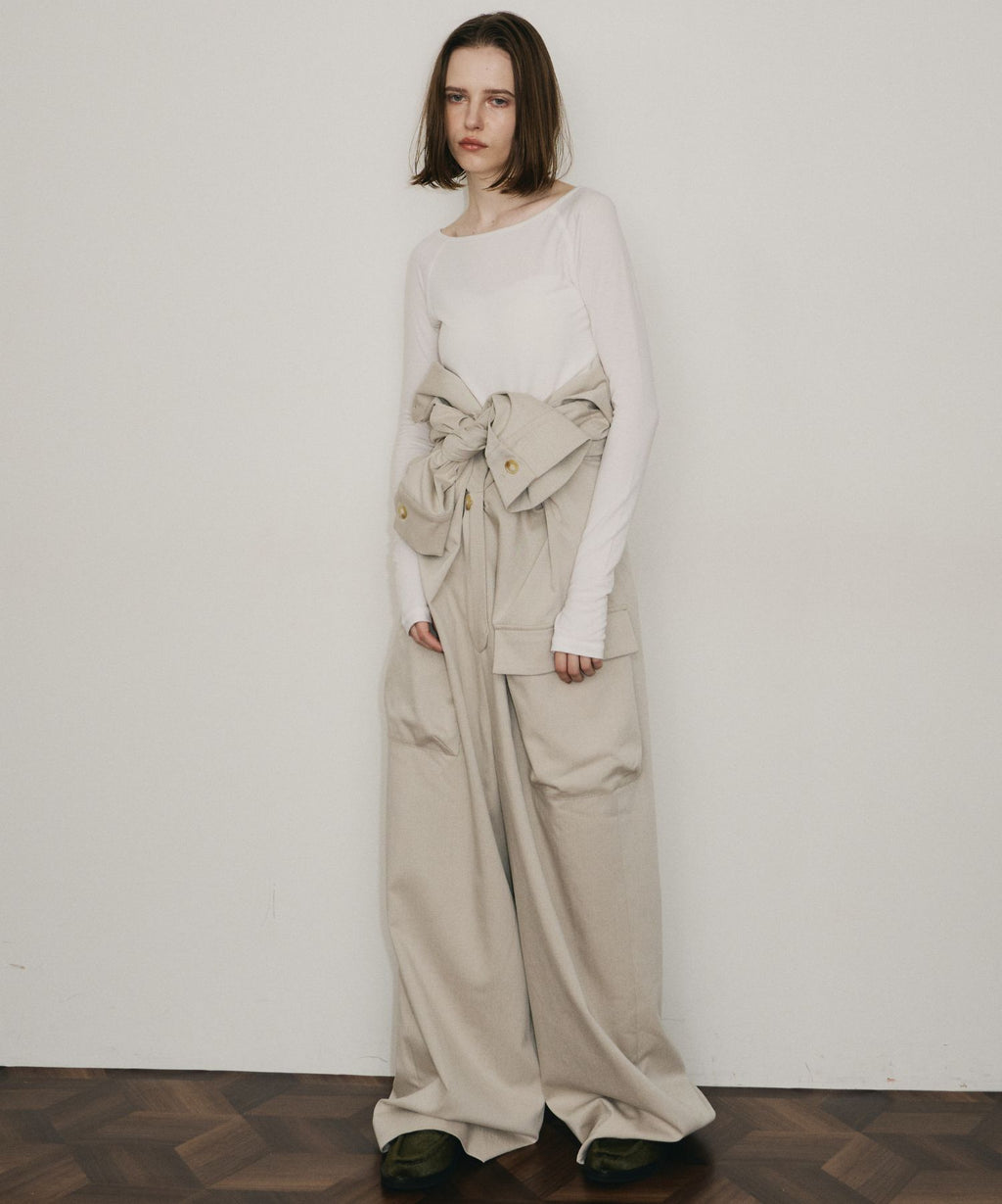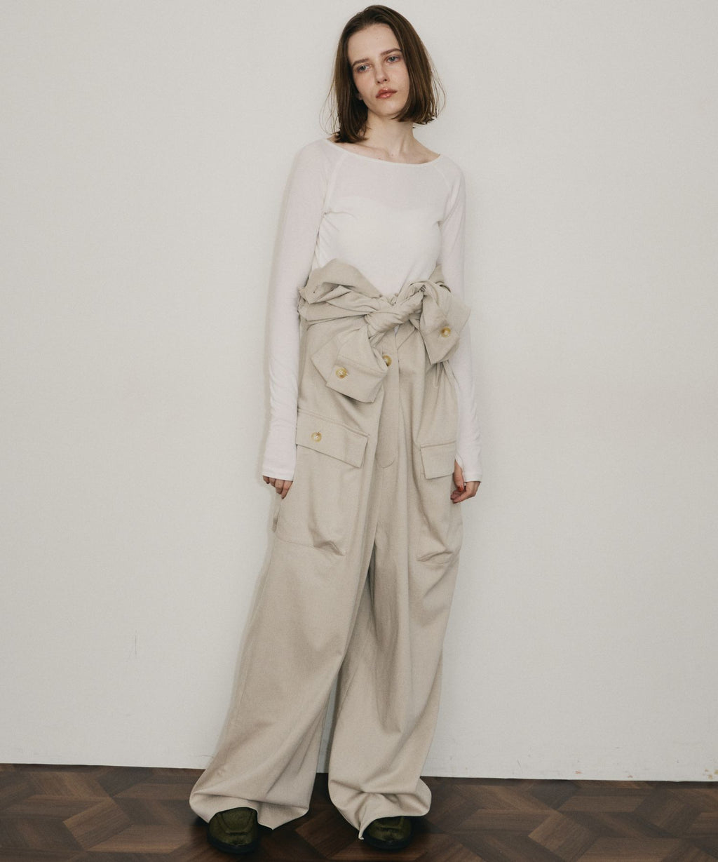 ラペルボタンを留めるとよりモードな印象に。腰で巻いてトップスを見せても◎